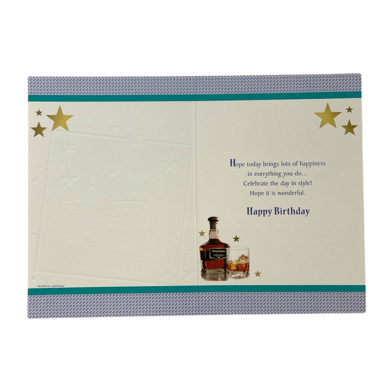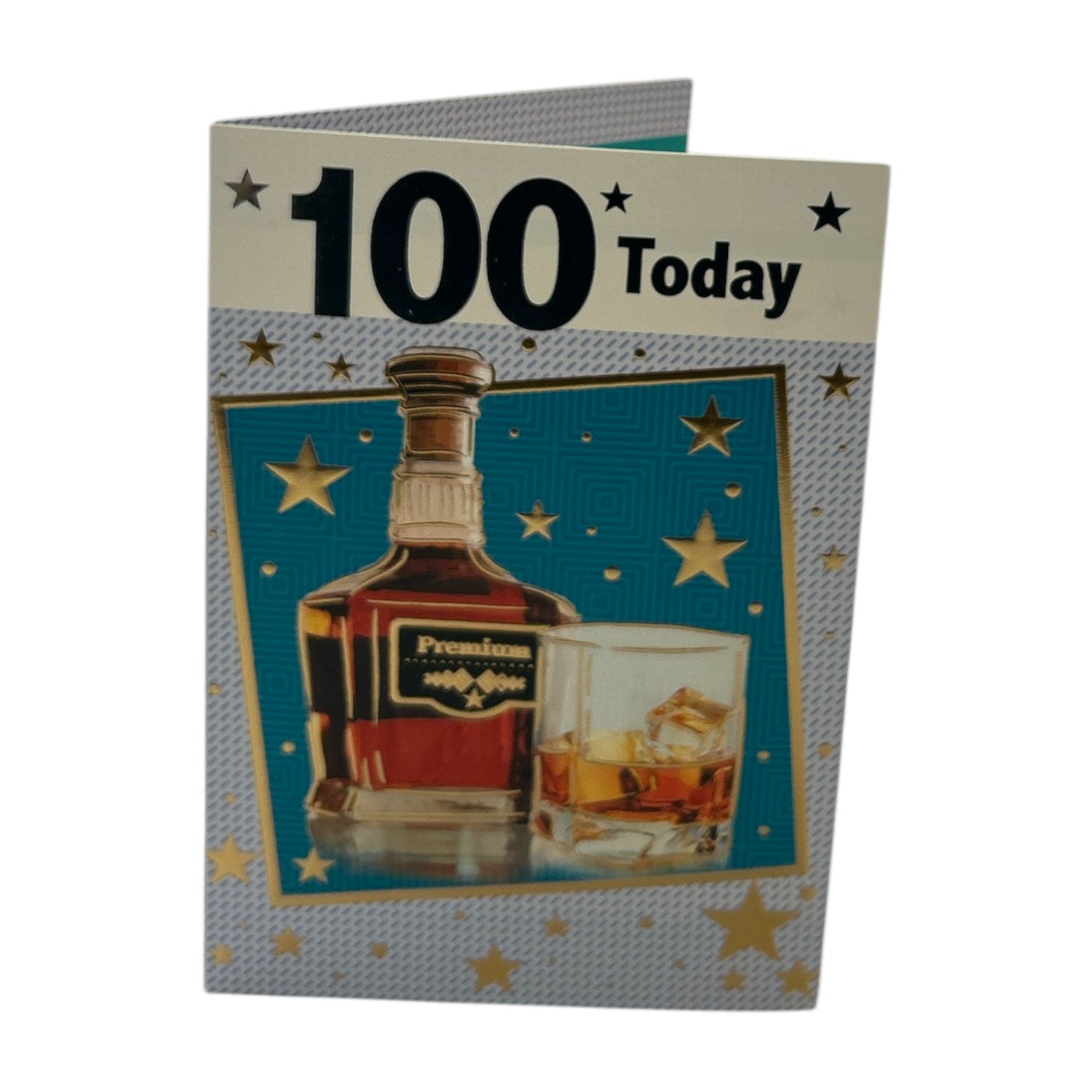 This is a celebratory greeting card featuring a stylish and festive design. The card prominently displays the number "100" in bold, shiny gold lettering, suggesting a milestone celebration—possibly a 100th birthday, anniversary, or achievement. The background is split into two sections: one side is white, and the other is a royal blue with diagonal stripes, decorated with golden stars of various sizes for a festive touch. In the foreground, there's an elegant illustration of a bottle labeled "Premium" and a glass of whiskey on the rocks, conveying a sense of luxury and toast-worthy celebration. Card size: Approx. 19.5 x 14 cm.