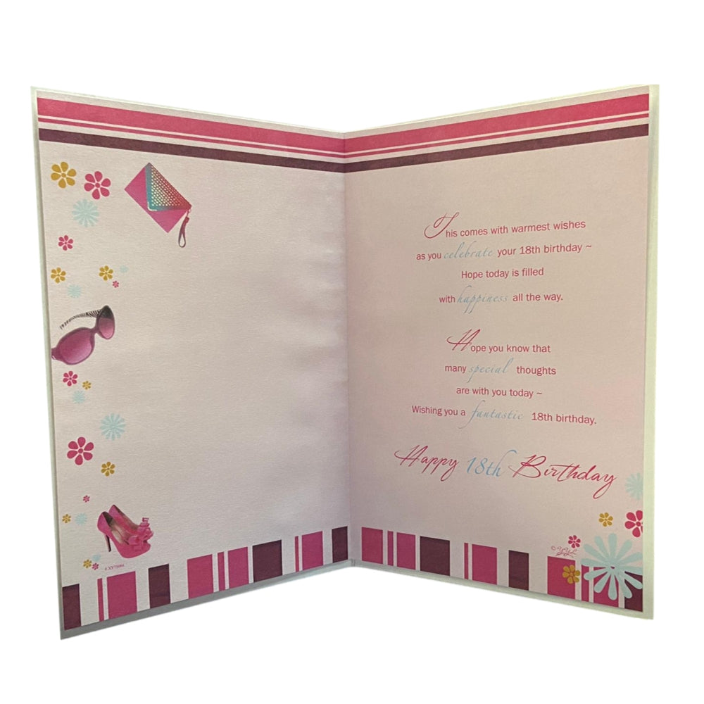 Lovely Verse With beautiful Pink Dress 18th Birthday Card. High quality Xpress Yourself Classic Xpressions Birthday Card. Approx size of card is 6" x 9" inches. Stylish design and verse.