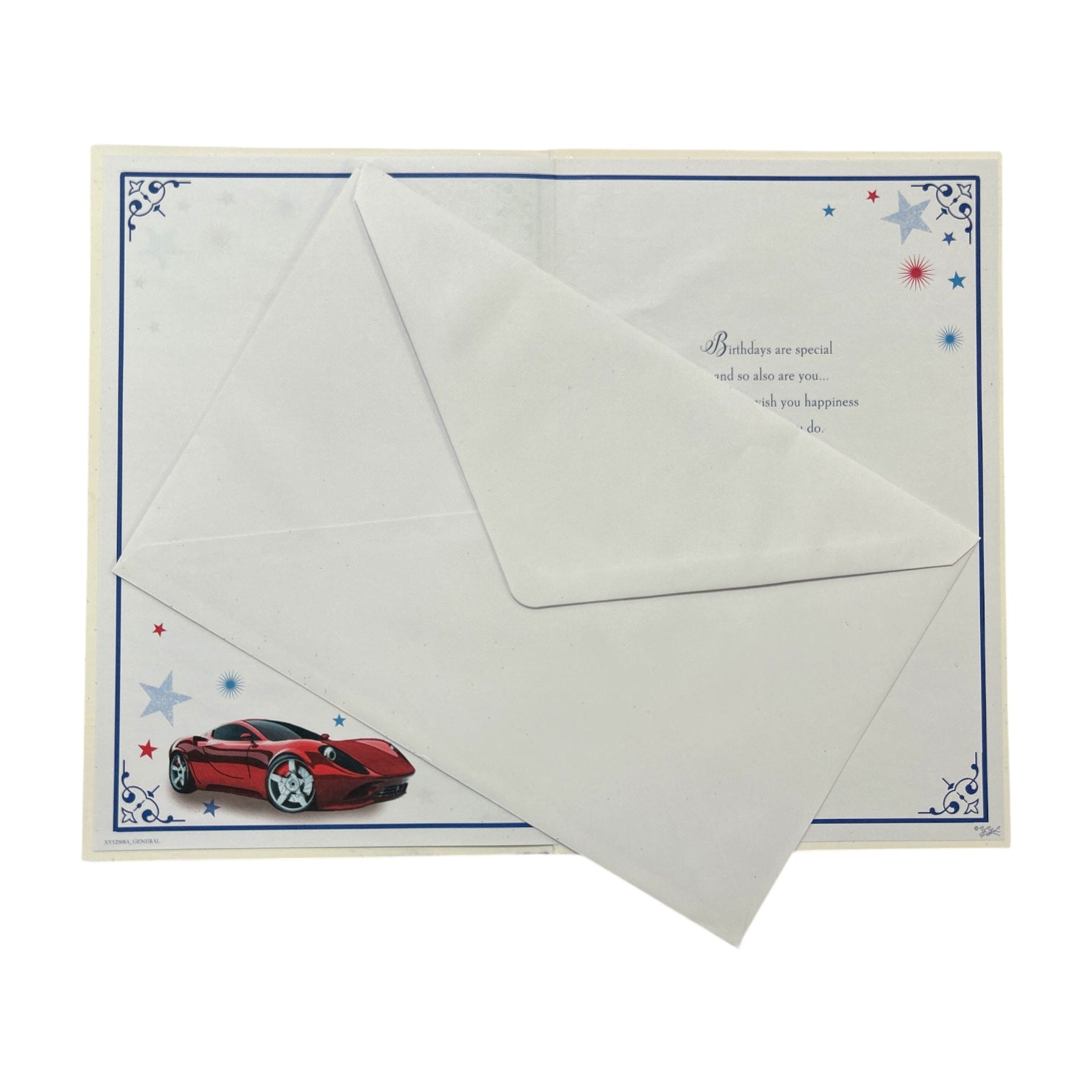 This extra large 40th birthday card features a sports car design parked in the driveway with silver foil lettering and blue glitter wishing him happy birthday. Measuring 18 x 27 cm, this card from Xpress Yourself is printed on quality cardstock with foil and glitter accents for an extra special birthday greeting. The front of the card shows a sports car parked in the driveway, personalized with "You're 40 Today Happy Birthday" making it a thoughtful gift for this milestone birthday. Inside the card, additional personalized text reads "Happy Birthday!" providing the perfect sentiment to go along with the fun exterior design. This ready-made 40th birthday card can be easily signed and sent without any other accessories needed to wish him a happy birthday from afar.