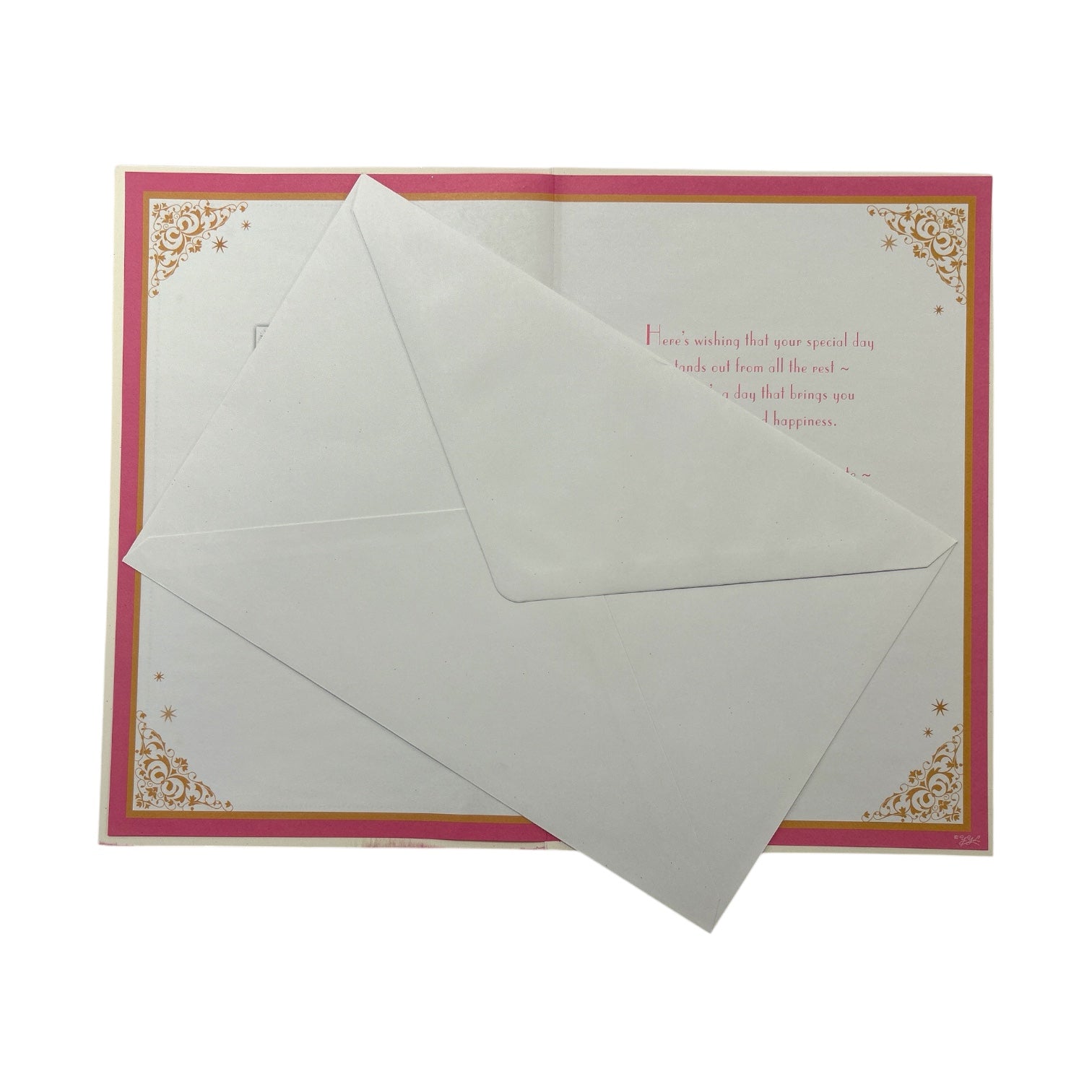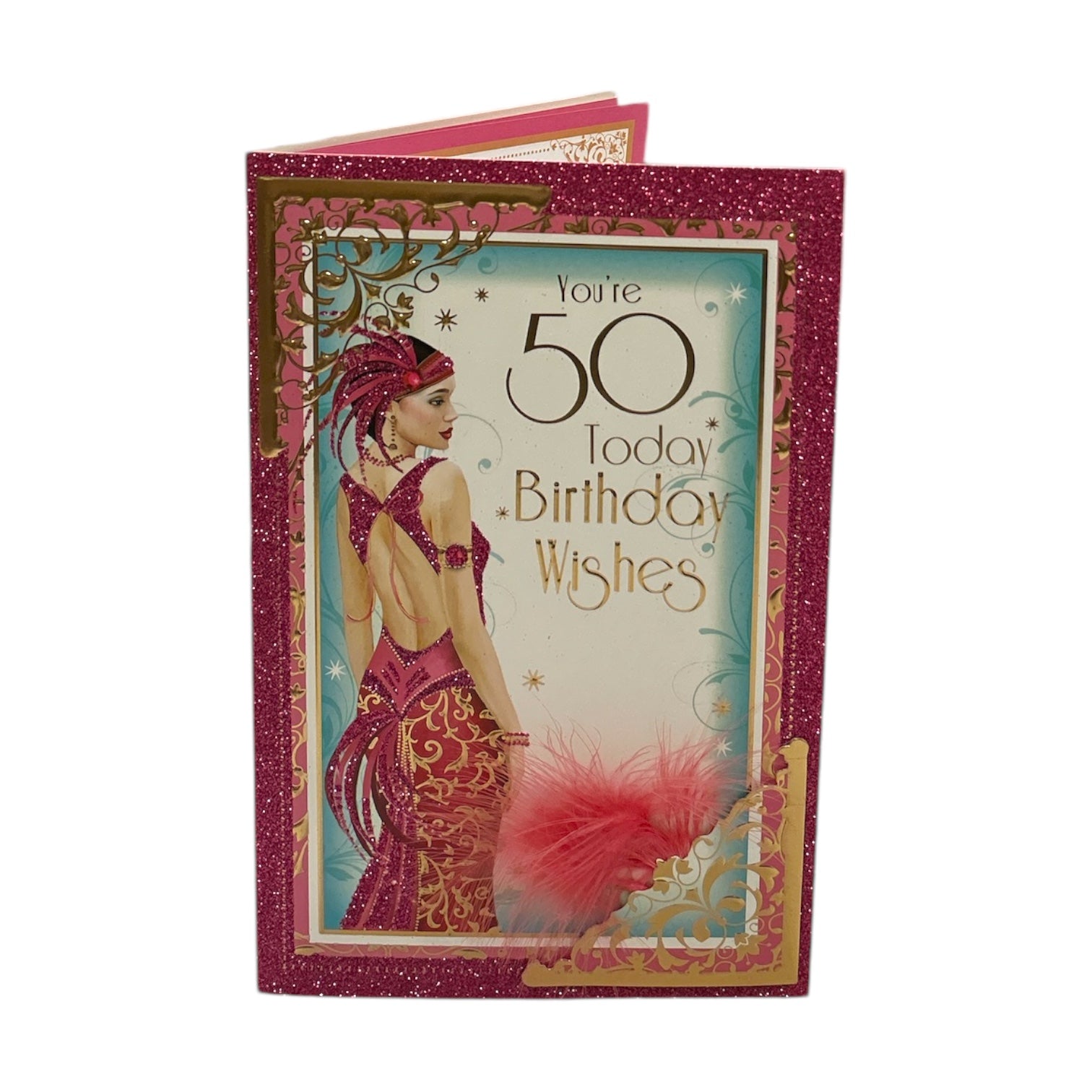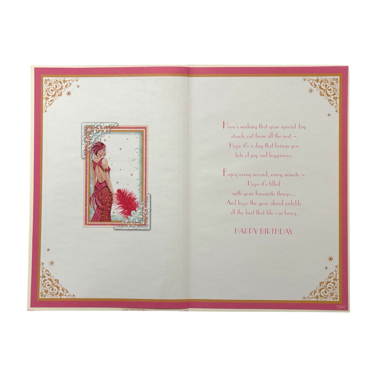 Celebrate a milestone birthday in style with this stunning and sophisticated card, perfect for a woman turning 50. The design features a glamorous woman dressed in a flapper-era gown, exuding grace and elegance. The intricate gold-colored patterns and ornate flourishes frame the image beautifully, enhancing the card's luxurious feel. A striking arrangement of red feathers adds a touch of drama and vintage charm. The subtle glitter accents bring a dazzling sparkle, making this card a truly special keepsake. Inside, the same design continues, paired with heartfelt birthday wishes, making this card a perfect way to celebrate a remarkable milestone in a truly elegant and memorable way. The card comes with a coordinating envelope. Approximate size: 27.5 x 18.5 cm.