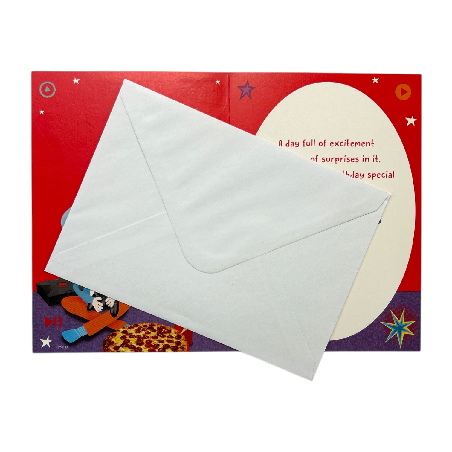 Level up the birthday celebrations with this fun and vibrant card! The front features a 11-year-old boy seated and fully immersed in playing video games, surrounded by a gaming console, pizza, and a drink—creating the perfect gaming setup. His expression reflects focus and excitement, capturing the joy of a great gaming session. The bold red background adds energy to the design, making it eye-catching and dynamic. At the top, the words "Happy Birthday You're 12" are prominently displayed in a multicolored, slightly embossed font, adding a festive touch. Inside, the card includes warm birthday wishes, making it the perfect choice for a young gamer. This card is a fantastic way to celebrate a special 11-year-old’s big day. The card comes with a coordinating envelope. Card size approx. : 19 x 13cm.