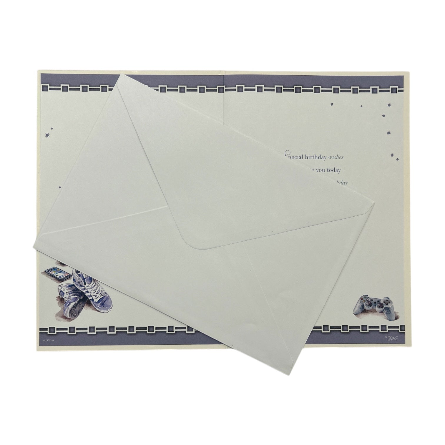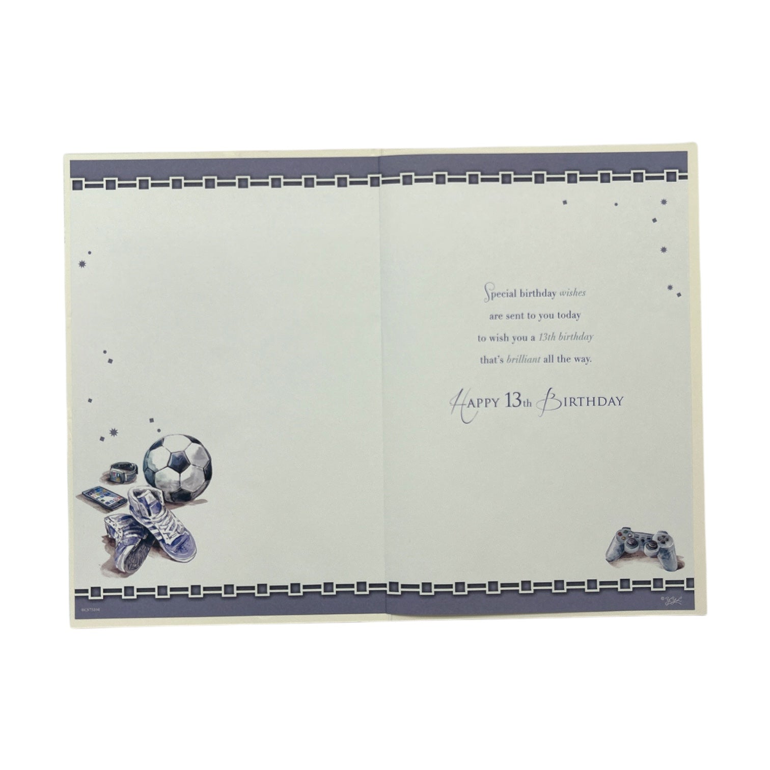 A stylish card, suitable for sending a kind, heartfelt message to a male friend or family member on his 13th birthday. featuring a video gaming, shoes, football, watch and cellphone design card finished with foil details. The card comes with a coordinating envelope. This fun card is perfect for the birthday boy turning age 13. It will show them that you want to wish them lots of happiness on their special day.