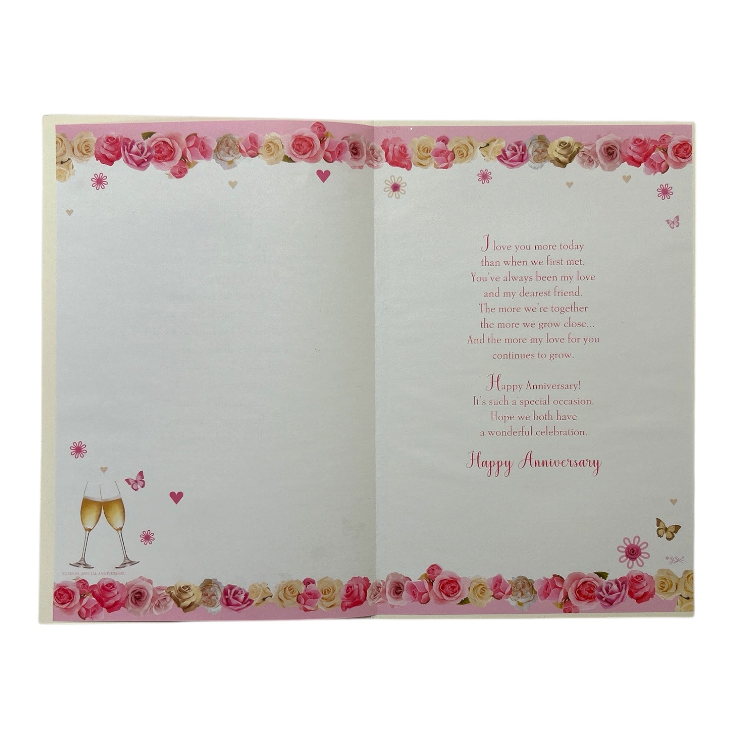 This elegant Pearl Anniversary card beautifully celebrates 30 years of love and commitment. The design features a pink and cream roses in a heart-shaped design symbolizing romance and lasting devotion. Adding to its charm, silver glitter accents create a subtle shimmer, while two champagne flutes elegantly represent a joyous toast to the milestone. A light purple ribbon, tied in a delicate bow, enhances the card’s sophistication. Small hearts, butterflies, and decorative elements are scattered throughout, enriching the design with warmth and elegance. Inside, heartfelt Pearl Anniversary wishes complete this beautiful keepsake, making it the perfect way to commemorate this special occasion with love and appreciation. The card comes with a coordinating envelope. Approximate size: 27.5 x 18.5.