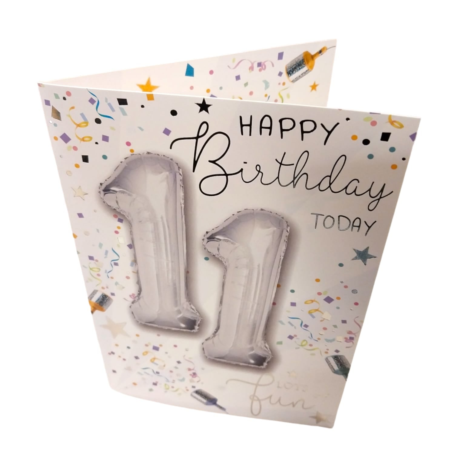 A contemporary foil finished greeting card by Balloon Boutique. Air fill only (not suitable for helium). Includes 2 Foil Balloons, straw for inflating balloons. 2m Ribbon for handing balloons. Unsuitable for helium. Size of card 190x130mm. Message inside: This comes to say, Have a happy 11th Birthday! Happy Birthday.