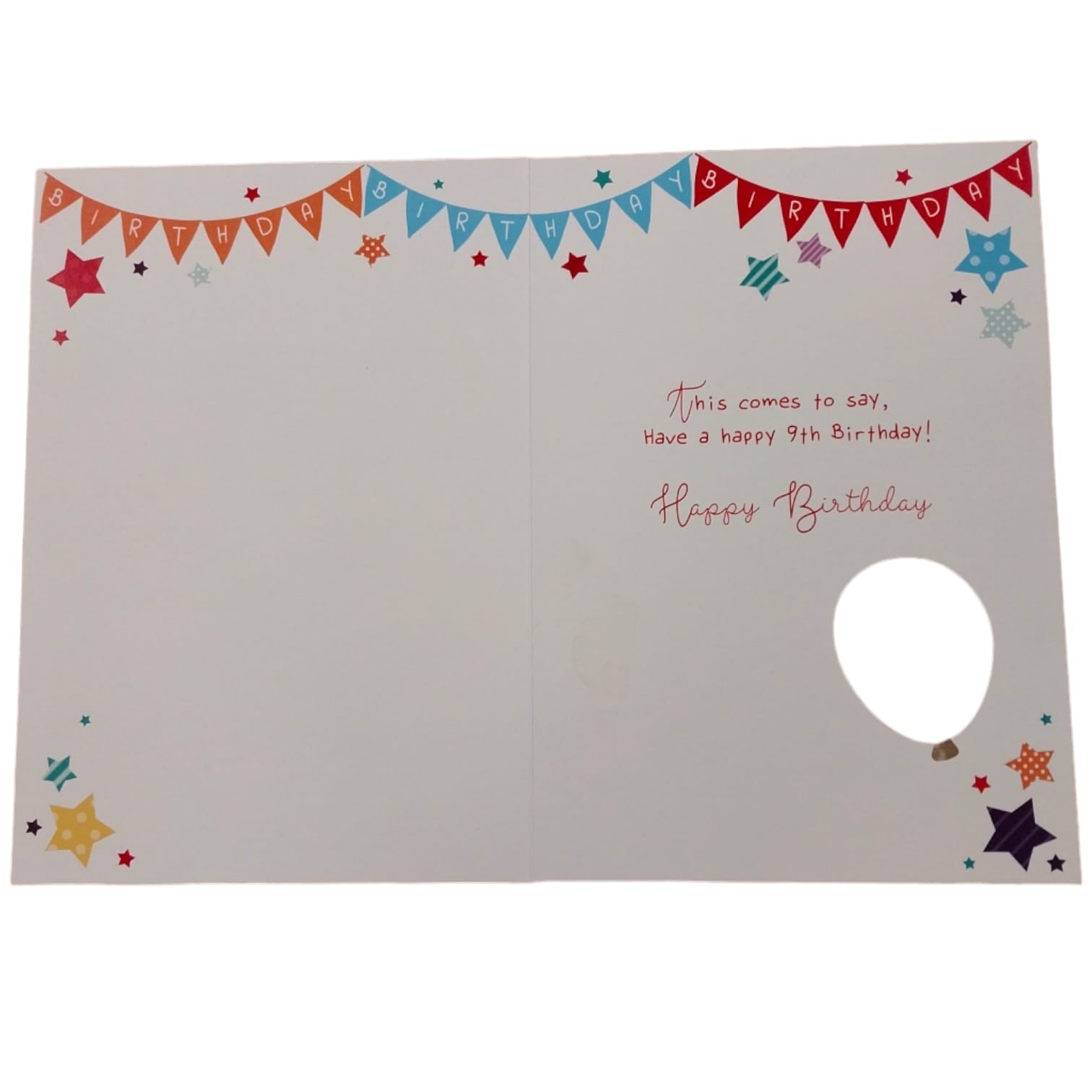 A contemporary foil finished greeting card by Balloon Boutique. Air fill only (not suitable for helium). Includes 2 Foil Balloons, straw for inflating balloons. 2m Ribbon for handing balloons. Unsuitable for helium. Size of card 190x130mm. Message inside: This comes to say, Have a happy 9th Birthday! Happy Birthday.