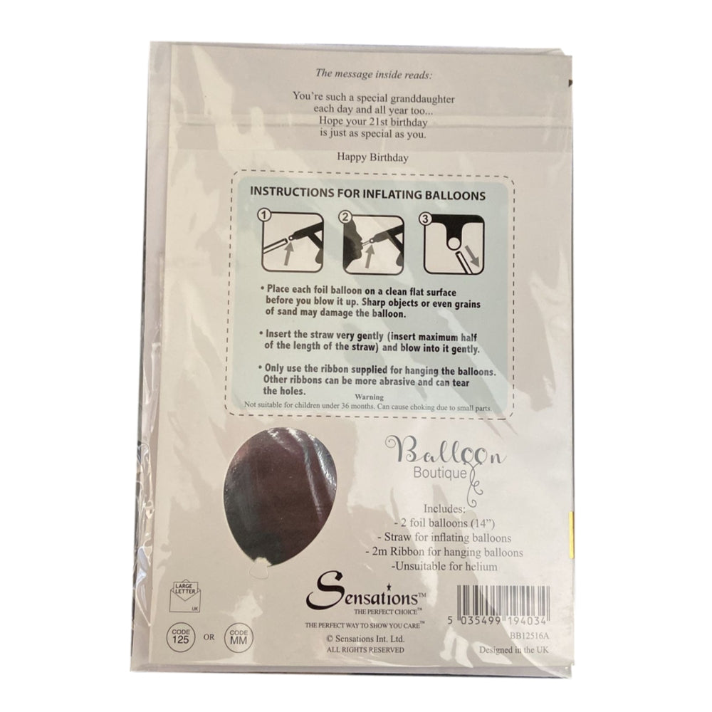 The "To a Special Granddaughter You're 21 Balloon Boutique Greeting Card" is a delightful and contemporary card designed by Balloon Boutique, perfect for celebrating a granddaughter's 21st birthday. This unique greeting card features two eye-catching foil balloons shaped in the numbers "21", adding a touch of festivity and charm to the occasion. The size of the card, measuring 230x150mm. Along with the balloons, the card includes essential accessories for inflation, such as a straw for inflating the balloons and 2 meters of ribbon for hanging them, ensuring easy setup and display. It's important to note that these balloons are designed for air fill only and are not suitable for helium. This Balloon Boutique Greeting Card combines the timeless tradition of sending heartfelt wishes with the fun and whimsy of balloon decorations, making it a perfect choice to celebrate a granddaughter's 21st birthday in style.