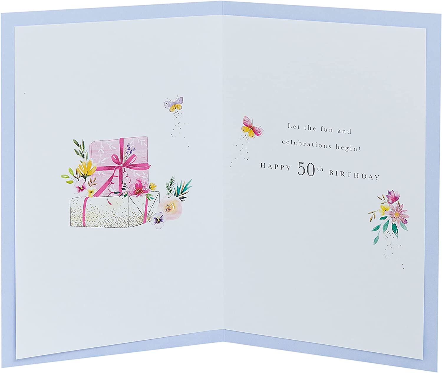 Send happy 50th birthday wishes with this traditional card featuring gifts and flowers, finished with gold foil accents. Message Inside Reads: Let the fun and celebrations begin! Happy 50th Birthday. Card Size: 137mm x 210mm. Envelope Included.