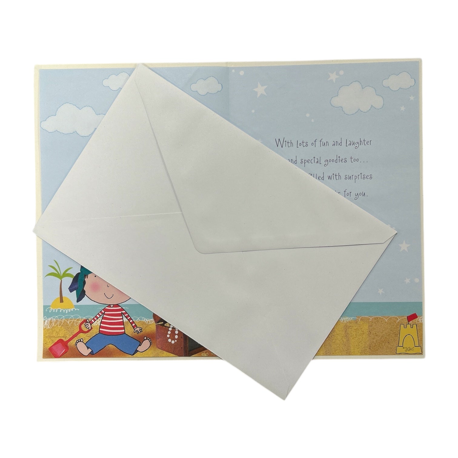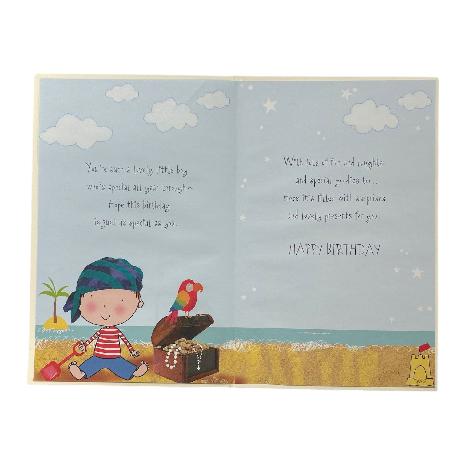 Celebrate your Son’s second birthday with this playful and sparkling card featuring a glittery pirate-themed design. On the front, a little boy dressed in a glitter pirate outfit is joyfully playing in the sand, bringing the spirit of adventure to life. Next to him, a parrot perches on a treasure chest, while star foil glittery balloons and three additional balloons are tied to the chest, adding a festive and magical touch. The background is filled with fluffy clouds and sparkling stars, creating a sense of wonder. The text "Son, You're 2" and "Birthday" is written in glitter-filled, multicolored letters, making it a cheerful and celebratory design. Additionally, a large, round badge with the message "2 Today" adds a fun touch, making this card extra special for your Son. Inside, you'll find warm birthday wishes that are sure to bring a smile to his face. The card comes with a coordinating envelope. Approximate size: 27.5 x 18.5.