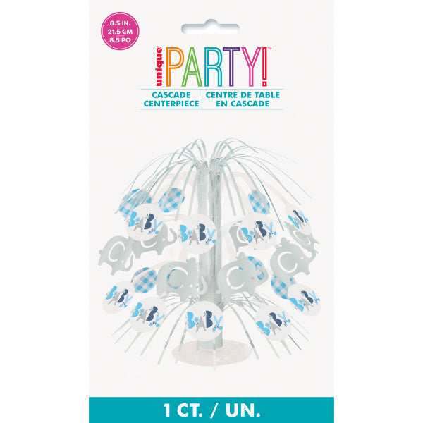 Blue Floral Elephant Cascade Centerpiece 8.5". This centerpiece features elephants and circular cutouts printed with a "Baby" headline. This is the perfect table decoration to use in your Baby Shower party. This centerpiece is perfect for indoor use and yet sturdy enough to serve as a table decoration for an outdoor or patio party. This centerpiece can stand up on its own.
