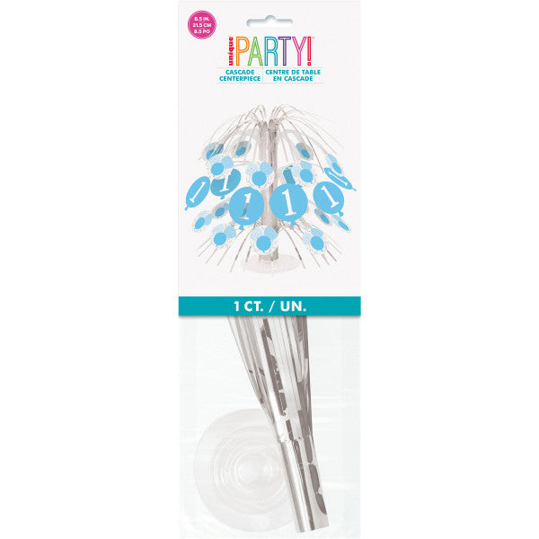 Blue Gingham 1st Birthday Cascade Centerpiece. This centerpiece featuring blue circular cutouts printed with the number "1" attached to silver foil fringe with a silver base. This is the perfect centerpiece to use on your birthday party table. This centerpiece is made of durable materials. This centerpiece can stand on its own.