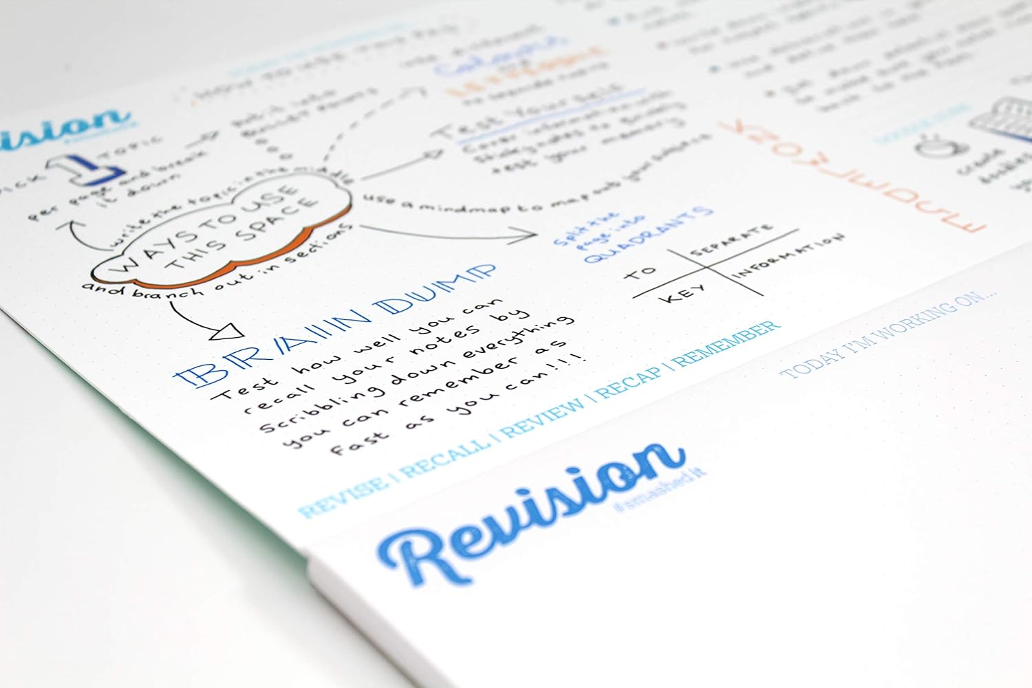 48 sheets 360x230mm Removable cover printed with "how to" guide Space for mindmaps, key notes, action points and doodles Dot grid areas for flexible note taking