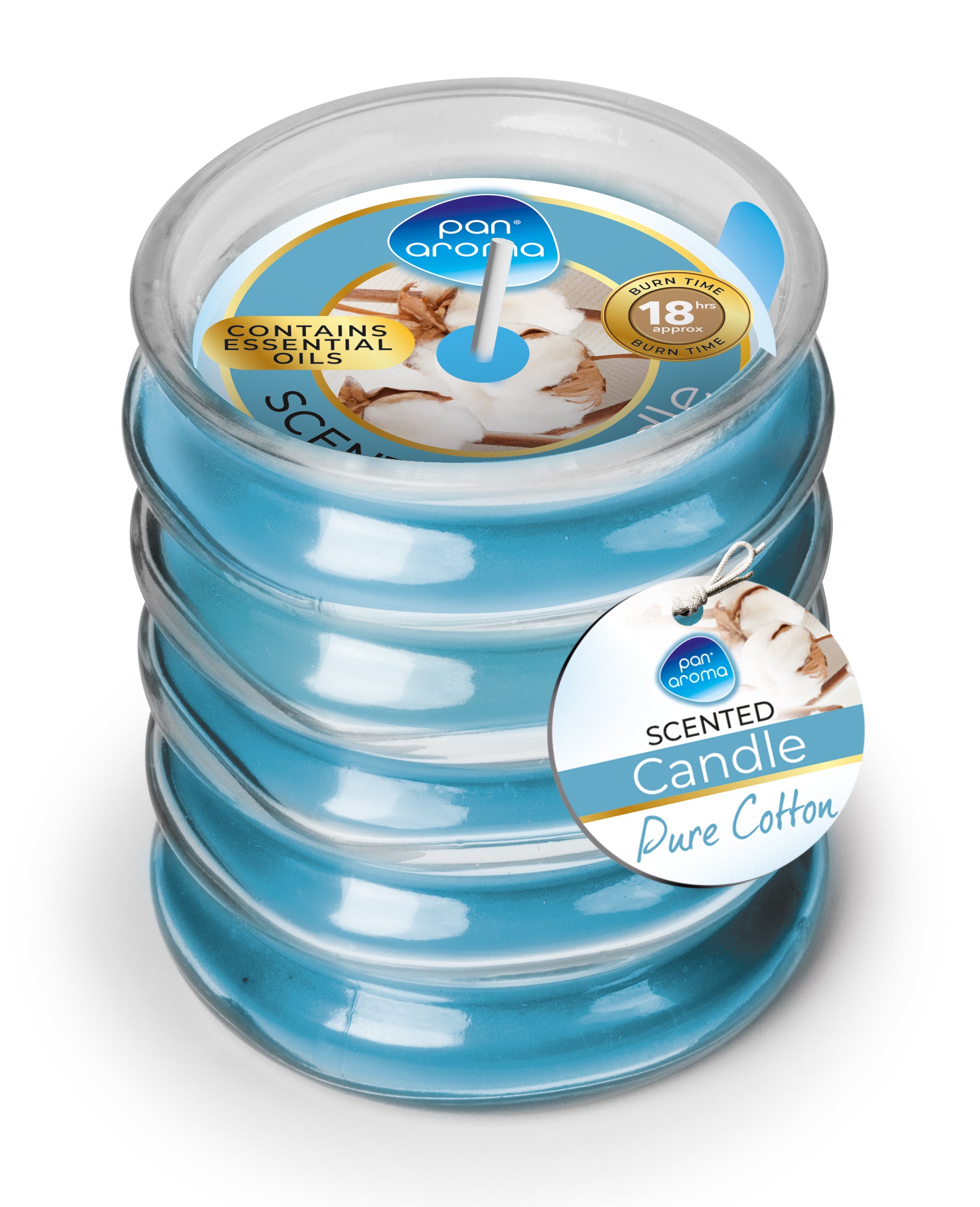 In a stylish barrel-styled ribbed glass jar, the Pan Aroma Scented Candle is enriched with essential oils to provide an aromatic Pure Cotton fragrance. A quick and convenient way to freshen up your living space, the Pure Cotton Scented Candle burns for approximately 18 hours.Pure Cotton Scented Candle adds a decorative touch, as well a refreshing aroma to the bedroom, bathroom and living space.