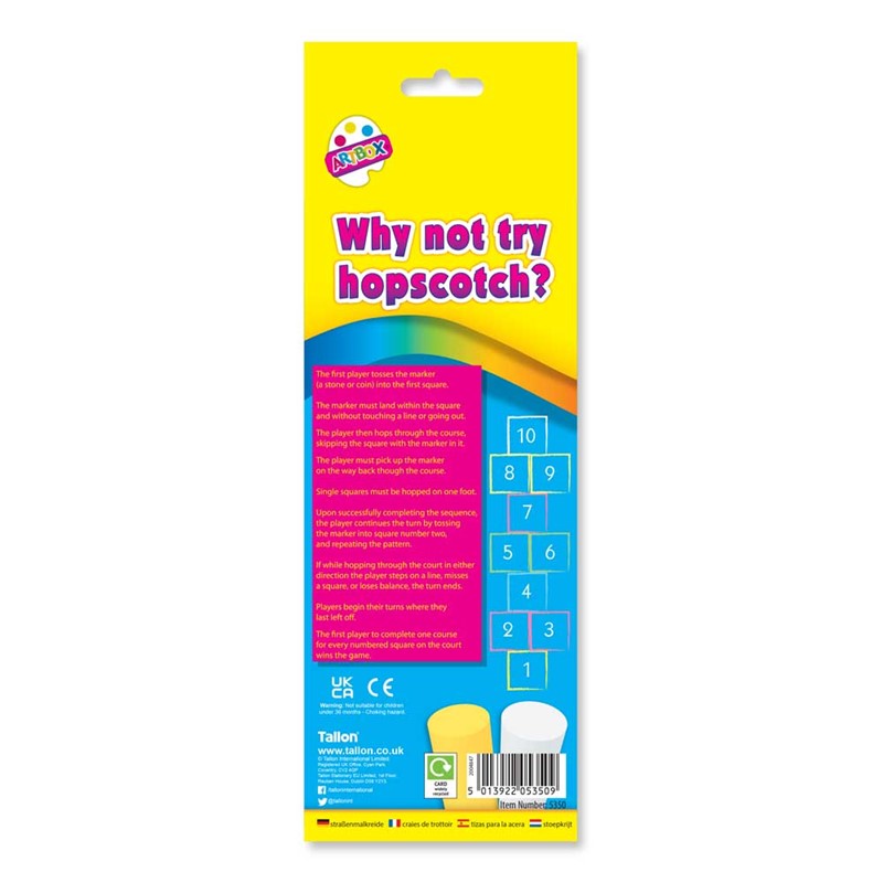 Box of 12 Giant Pavement Chalks. 10.5cm. Safe & non-toxic. Size: approx 8cm. This mixed giant chalk is perfect to create unique illustrations and patterns on the ground. Stored in a handy tub with lots of colours so everyone can get involved.