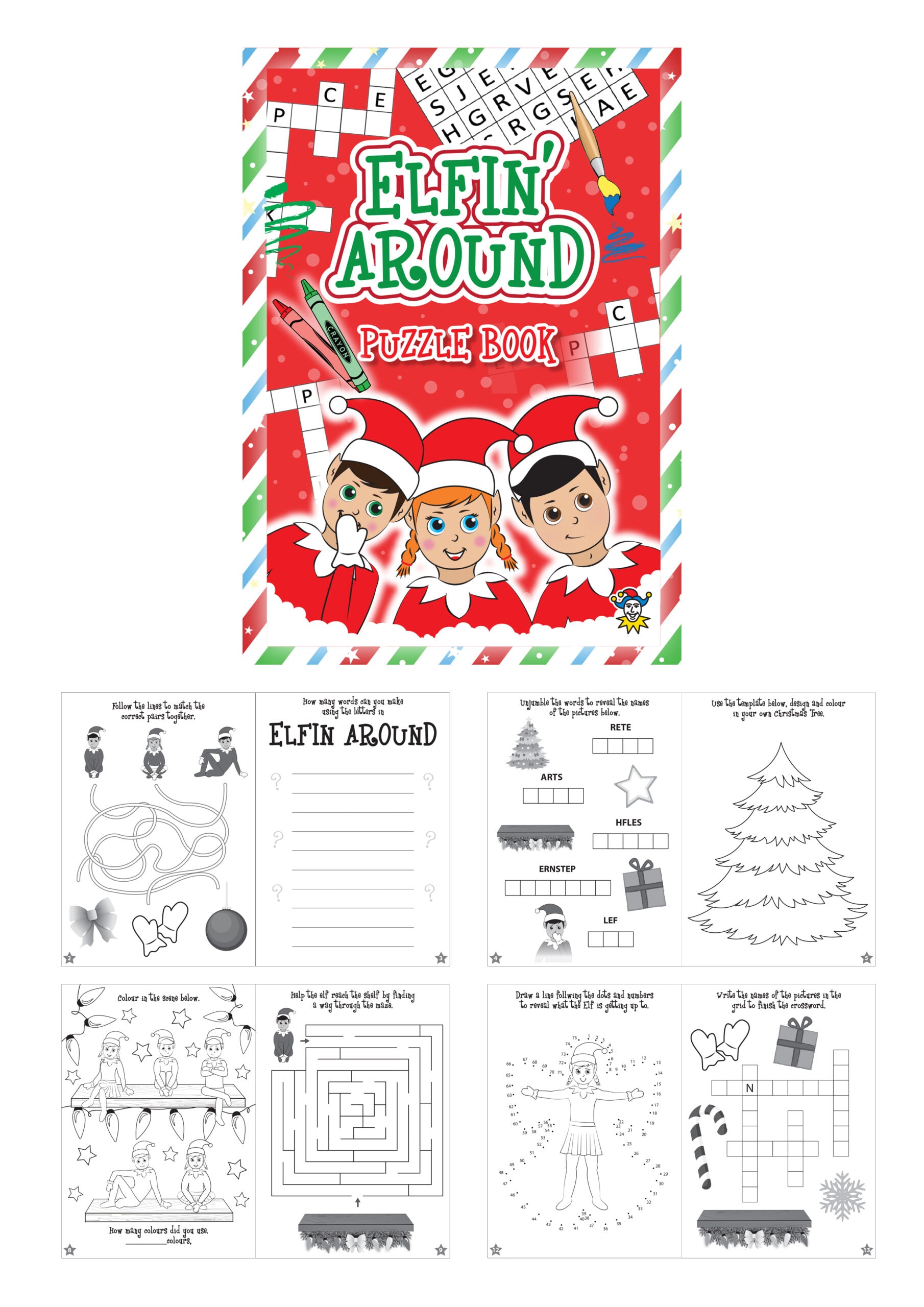 Mini Elfin Around Puzzle Book. These mini puzzle book with 'Elfin Around' design make ideal party favours and stocking fillers. Approximately 16 pages of activities, including colouring, spot the difference and word puzzles. Size: 10.5cm x 14.5cm.