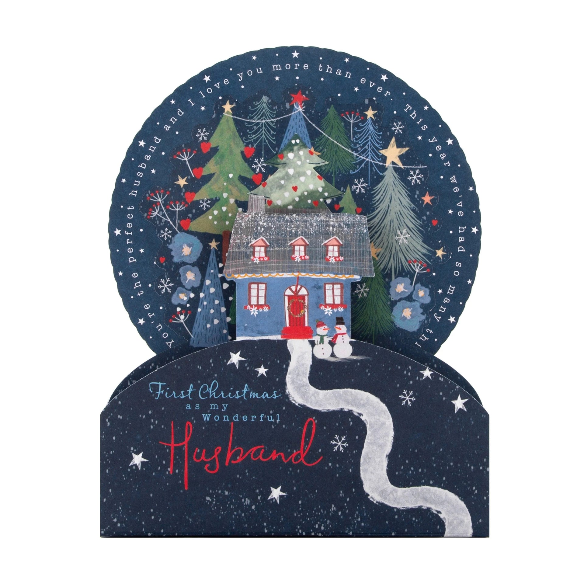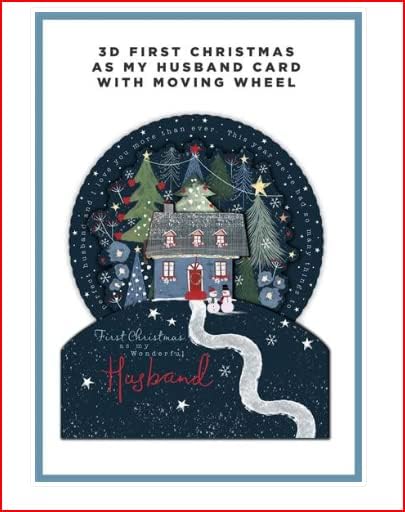 Celebrate your very first Christmas as a married couple with your amazing new husband, with this incredible 3D moving Christmas card. Printed on high-quality board, this card pops-up into a 3D display of a seasonal house and features a moving wheel with the message 'This year we've had so many things to celebrate together... You're the perfect husband and I love you more than ever.', space on the back for a personal message, and comes complete with a co-ordinating Hallmark branded, bright red envelope. This product is fully recyclable, and made of material from well-managed, FSC®-certified forests and other controlled sources. Message on back reads: To: From: Card measures: 22.8cm by 15.9cm, postage size within Standard UK 'Letter' Size limits.