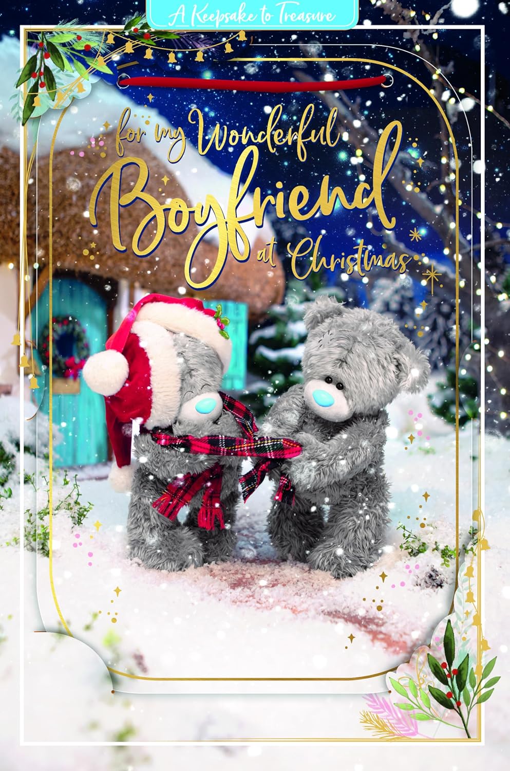 UNIQUE CHRISTMAS CARD FOR A SPECIAL BOYFRIEND - this luxury design in the Me to You '3D' range features an adorable lenticular image, bringing Tatty Teddy to life as you gently tilt the card! ORIGINAL ME TO YOU ARTWORK - the cute photo-real image shows two Tatty Teddy bears sharing Christmas fun together; the image is repeated on the inside and back of the card, with luxe gold detail to add extra sparkle DETACHABLE KEEPSAKE PLAQUE - the 3D image can be removed to create a lovely hanging keepsake plaque that's sure to be treasured long after Christmas Day 6x9 INCHES PREMIUM CARD WITH CHRISTMAS MESSAGE - the words on the front of the card read 'For my wonderful boyfriend at Christmas' while the message inside reads 'With all my love today & always'