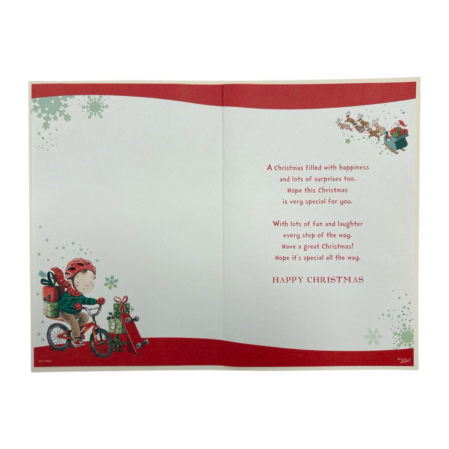 Celebrate your son’s holiday spirit with this vibrant Christmas card full of energy and cheer. Featuring a joyful illustration of a boy riding his red bicycle through a snowy scene, it captures the excitement of the season. A bold badge reading “Santa’s Little Helper!” adds a playful touch, perfect for a child who loves to be part of the festive fun. Wrapped presents, a skateboard, and falling snowflakes complete the lively backdrop, while Santa and his reindeer soar overhead delivering joy. Inside, a warm message reminds your son how special he is during this magical time of year. Crafted with care and bursting with color, this card is a keepsake he’ll treasure. It’s the perfect way to share love, laughter, and holiday adventure.