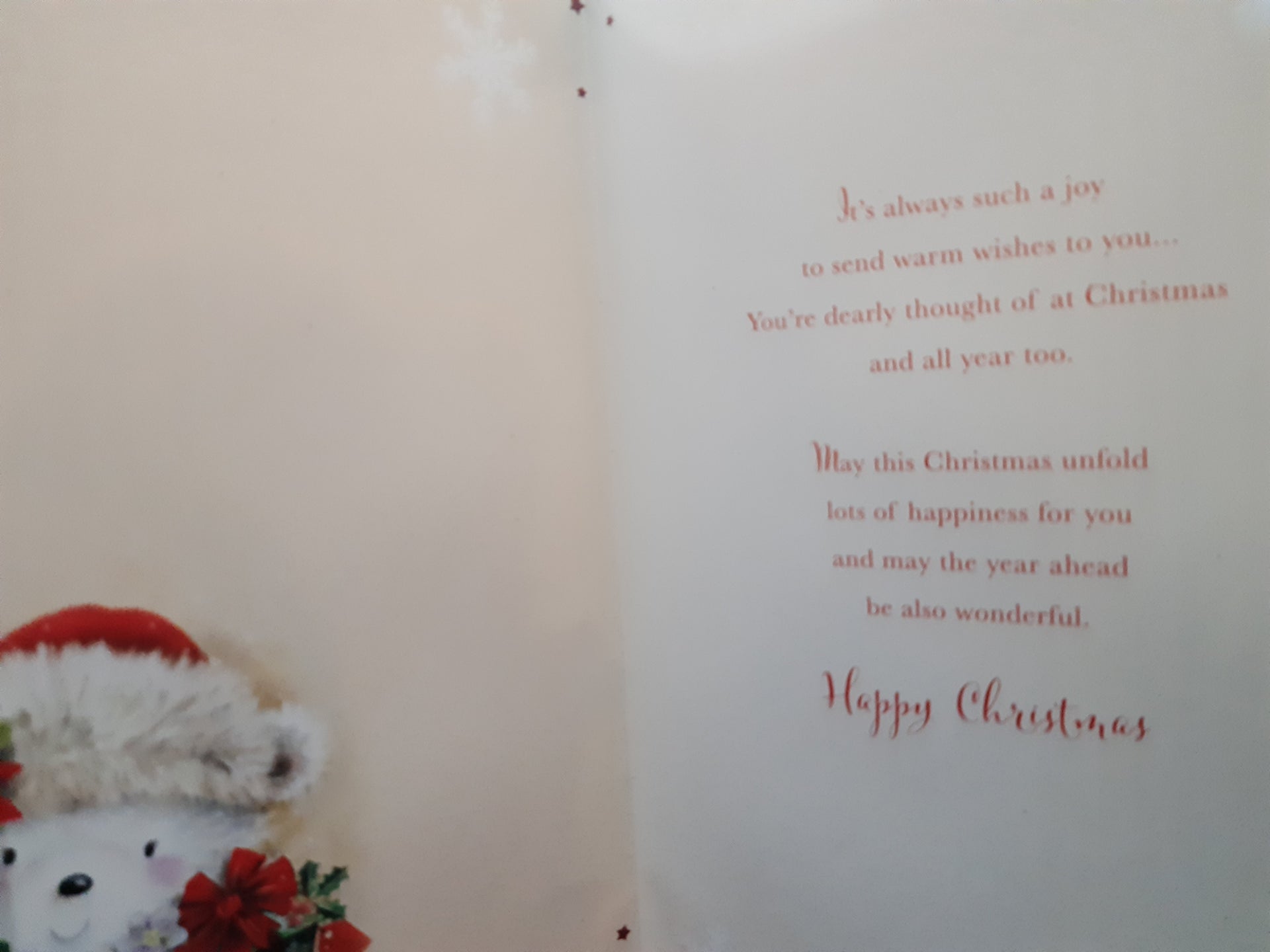 To a Dear Daughter In Law Cute Bear Holding Gifts Design Christmas Card. Approx Size 225 x 155mm.