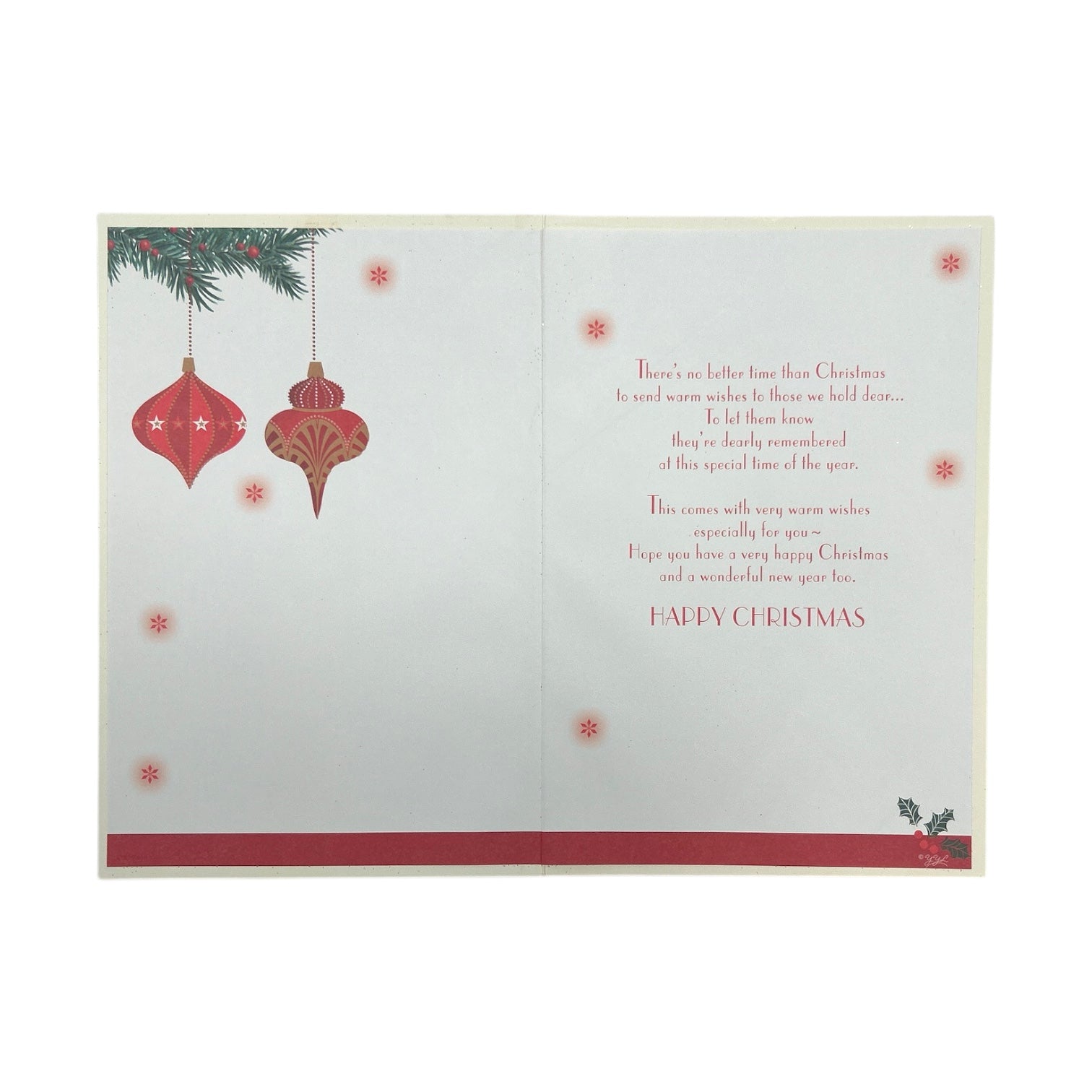 This festive Christmas card is a warm and elegant way to send seasonal wishes to a dear granddaughter and her family. The design features rich red and gold ornaments nestled among lush green pine branches, with a radiant star at the center symbolizing holiday magic. Ornate corner flourishes and glitter accents add a luxurious touch, making the card visually striking and emotionally meaningful. The message “Happy Christmas” is beautifully scripted, offering a heartfelt greeting that reflects love, joy, and togetherness. Perfect for expressing appreciation and warmth during the holidays, this card blends traditional motifs with refined detailing. Its premium finish and classic color palette make it ideal for gifting or catalog presentation. Whether displayed or sent with love, it’s sure to be cherished. Approximate size: 225 x 155 mm.