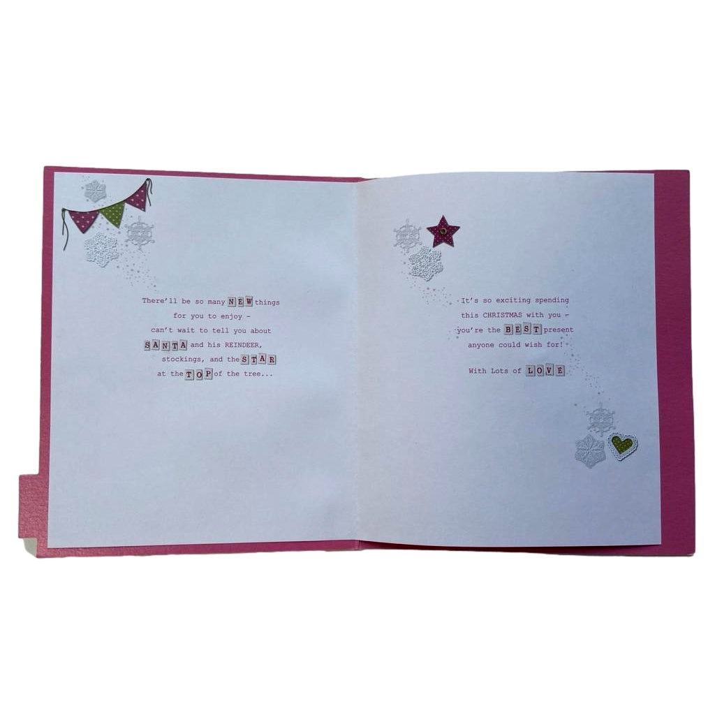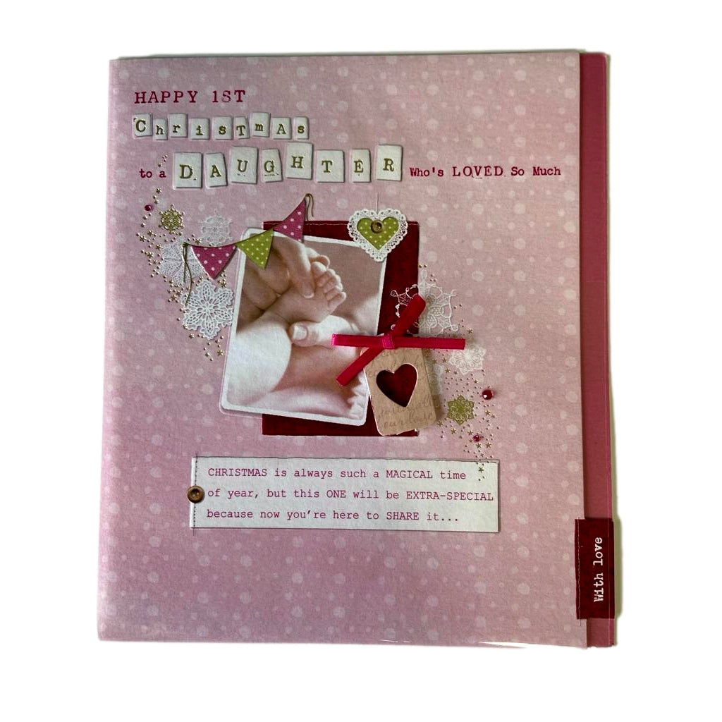 Happy 1st Christmas DAUGHTER Who's LOVED So Much Christmas Card By Carlton Featuring embossed lettering, a babies mobile and a beautiful photograph of a child's feet. Envelope height: 188 mm Envelope width: 164 mm Full Colour Insert - Embossed and Gold Foil Coated Card. With Envelope: Red