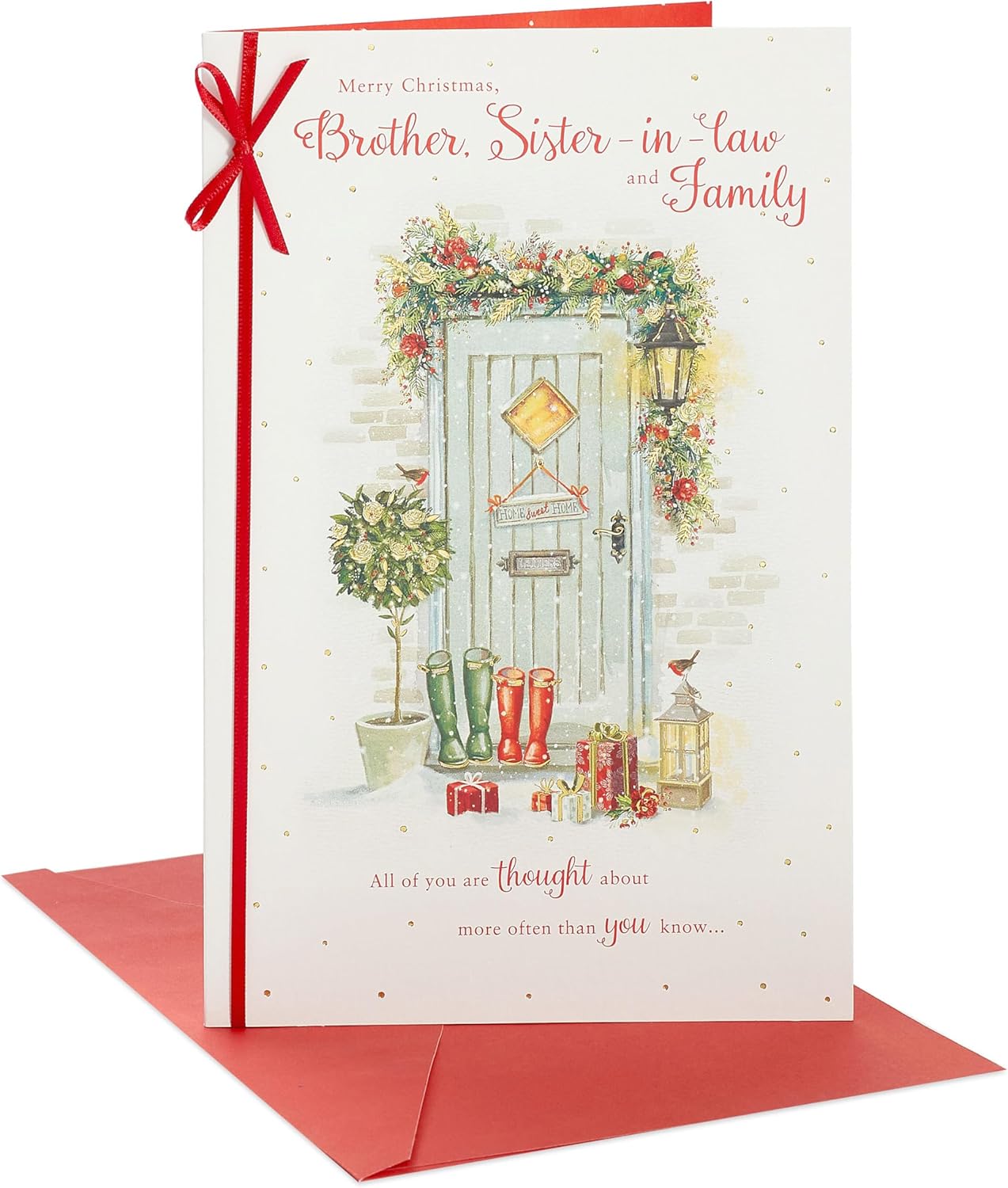 🎄 Send special Christmas wishes to your Brother, sister-in-law and their family with this beautifully illustrated card, finished with gold foil, red glitter and a red and white ribbon. ✏️ Message Inside Reads: and Christmas is the perfect time to pause and tell you so! Wishing you all a very Merry Christmas 🎅🏻 Christmas Card for Brother & Sister-In-Law 📏 Card Size: 149mm x 229mm 💌 Envelope Included