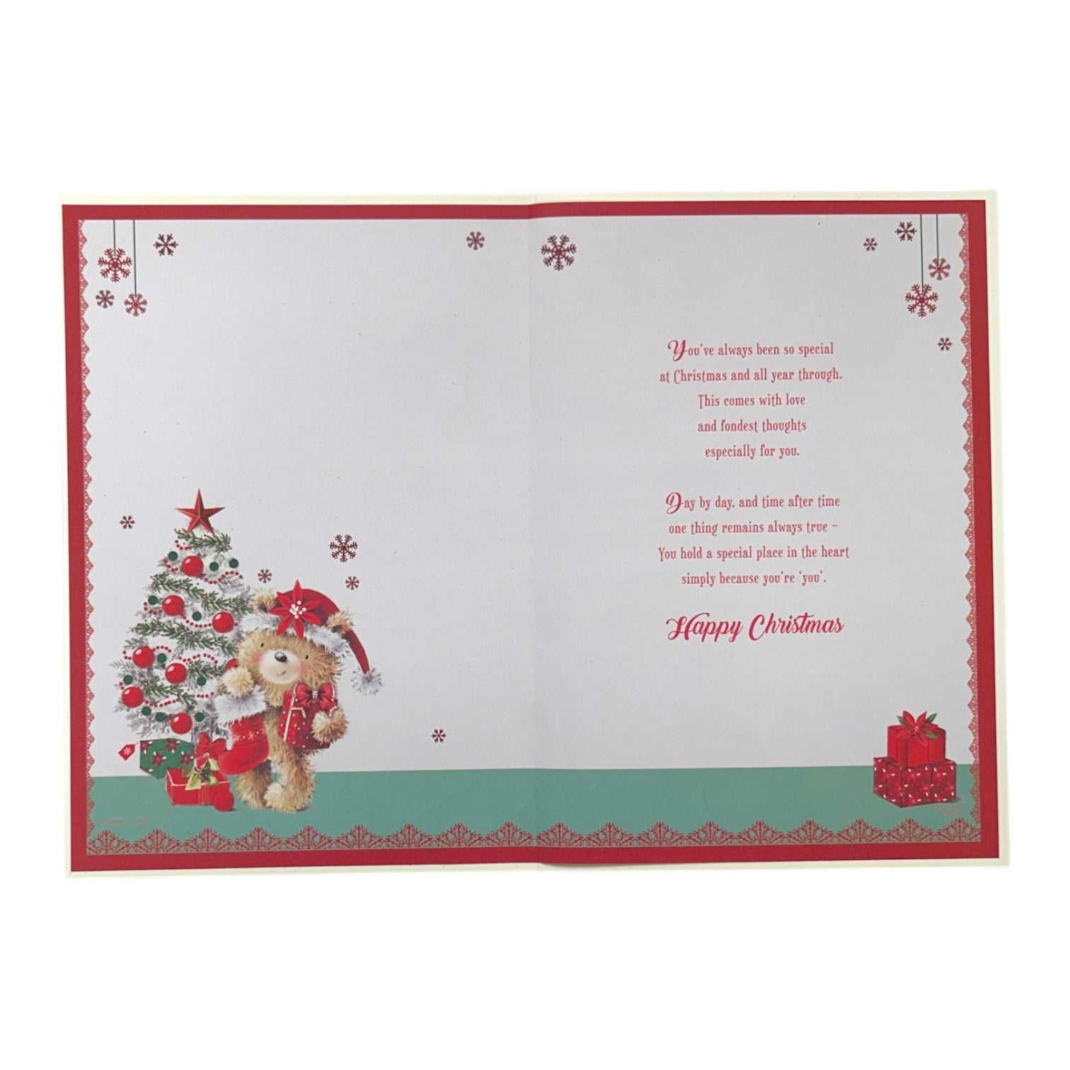Send warm festive cheer to someone special with this adorable Christmas card! Featuring a cuddly teddy bear holding gifts in front of a beautifully decorated tree adorned with red ornaments, it’s full of holiday charm. The festive banner with ‘Especially For You’ and ‘Christmas Wishes,’ along with the joyful message ‘Have a Wonderful Time,’ makes this card the perfect way to spread love and happiness. Finished with glittery snowflakes and a sparkling touch, it’s a keepsake your loved one will treasure this season.