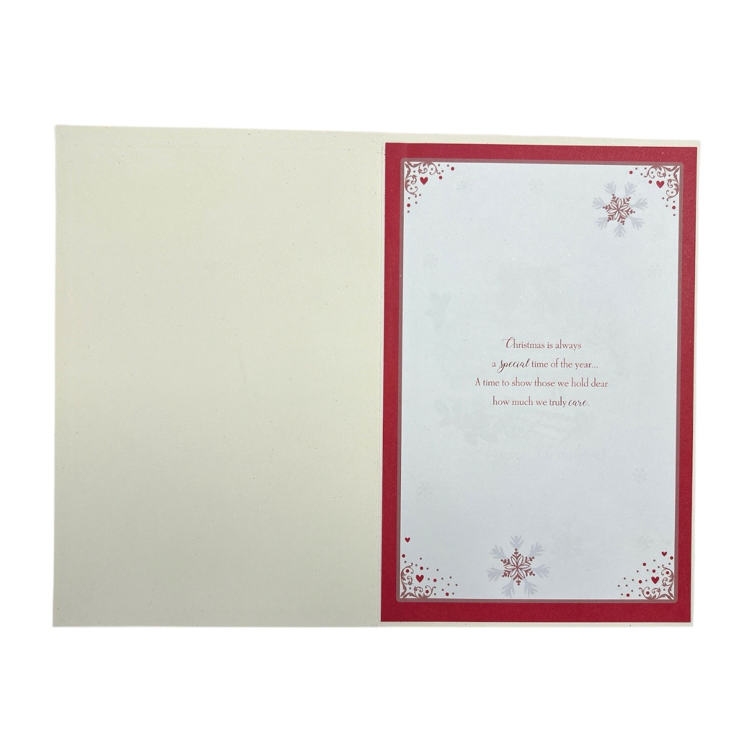 Celebrate the season with this enchanting Christmas card featuring a loving couple strolling through a snowy forest. Designed for a dear granddaughter and her partner, it’s framed with glittering red borders, gold flourishes, and festive holly accents. The heartfelt message inside expresses warm wishes for happiness, love, and a joyful future. A red bow and delicate snowflakes add elegance and charm. The romantic winter scene evokes cozy memories and seasonal magic. Ideal for gifting or display. Approx. size: 275 x 175 mm.