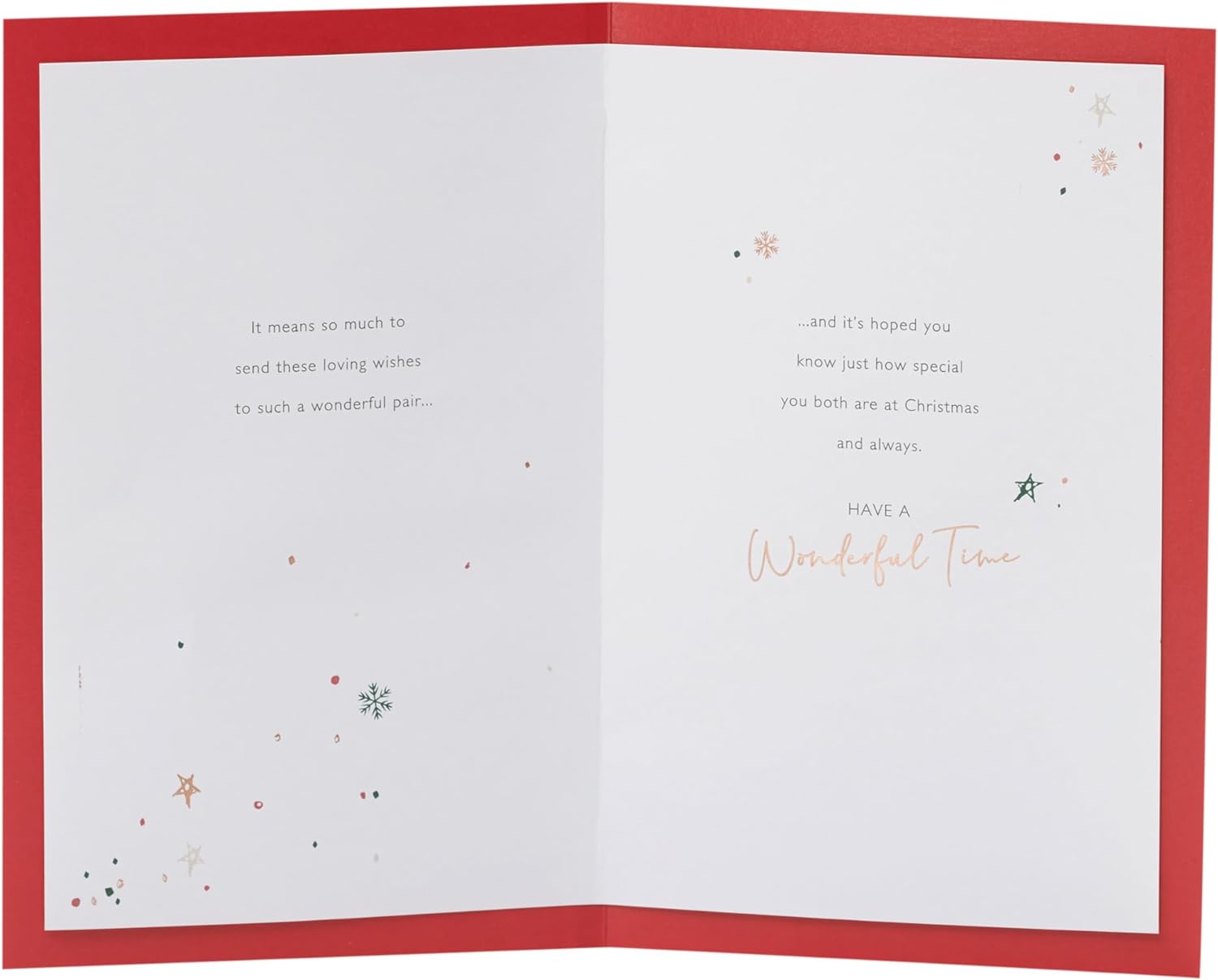 Let them both know how much they mean with this Christmas card, featuring a heartfelt message, and finished with gold and iridescent foil detailing! Message Inside Reads: ...and it's hoped you know just how special you both are at Christmas and always. Have a Wonderful Time. Card Size: 165mm x 254mm. Envelope Included.