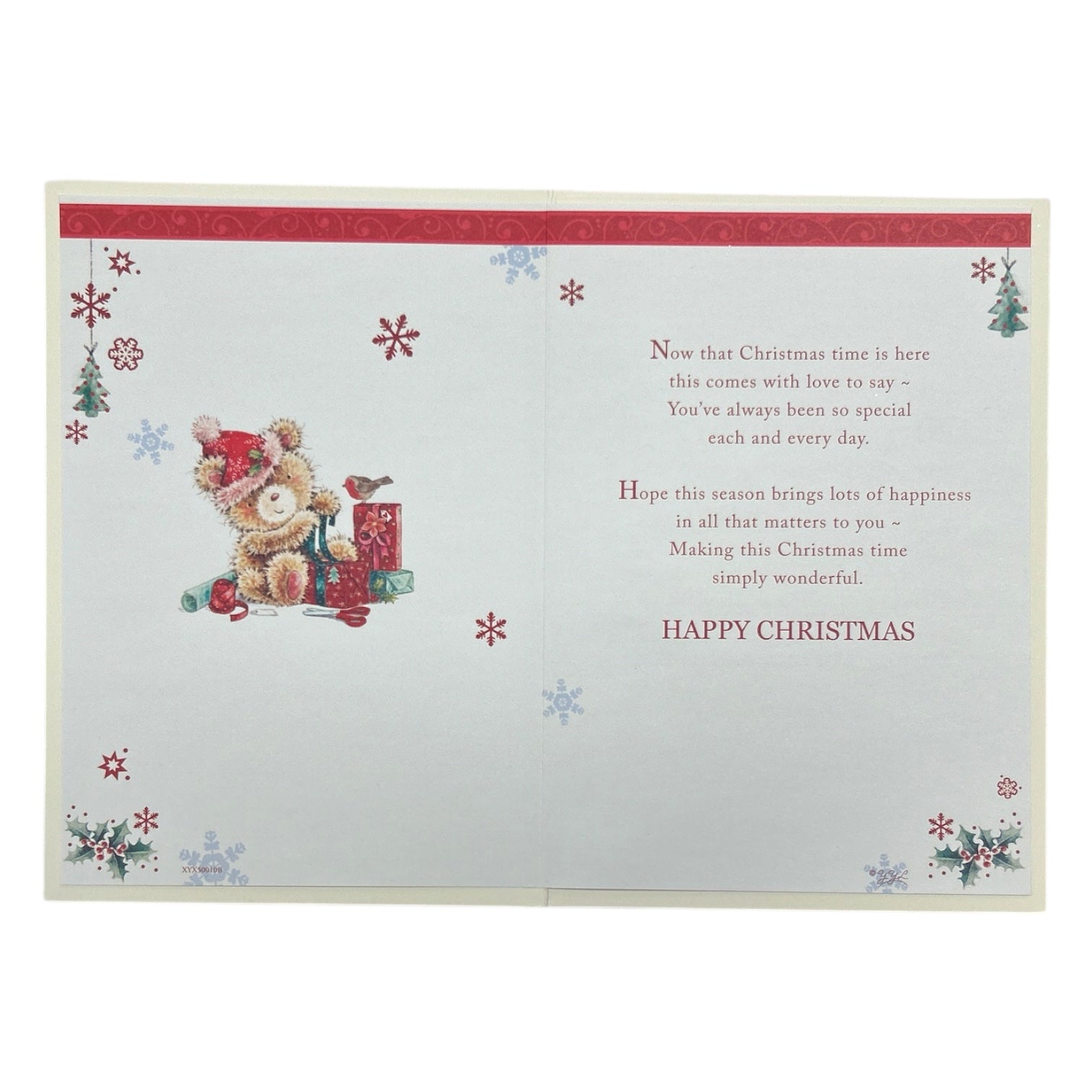 Share heartfelt holiday wishes with your daughter-in-law through this cheerful and festive Christmas card. Featuring an adorable teddy bear in a Santa hat surrounded by wrapped gifts, holly leaves, and sparkling snowflakes, the design radiates warmth and joy. A charming bird and glittery accents add playful elegance, creating a scene full of seasonal delight. The decorative red and gold label at the top highlights your loving message, making it clear this card is meant for someone truly special. Inside, your words will carry the spirit of appreciation and togetherness that defines the holidays. Thoughtfully crafted and full of charm, it’s a beautiful way to celebrate your bond. This card is a joyful keepsake she’ll treasure year after year.