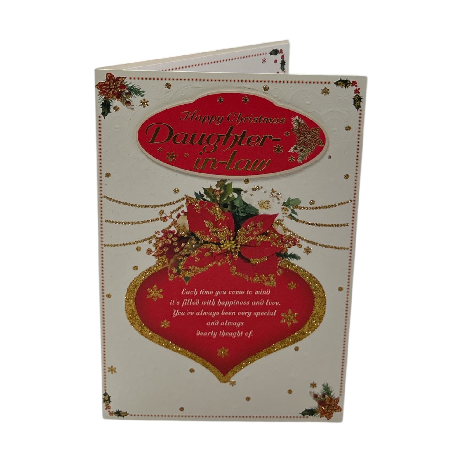 For a Special Daughter-in-Law Heart Poinsettia Design Christmas Card. This beautiful Christmas card features a heart-shaped design filled with a festive poinsettia arrangement, highlighted with gold glitter accents and delicate snowflake patterns. Set against a white background with ornate gold detailing, it carries the heartfelt message “This loving wish at Christmas comes with fondest thoughts to say – I love and appreciate you more with each and every day.” Warm, elegant. Beautifully designed and full of festive charm, it’s the perfect way to send love and Christmas wishes to a special Daughter-in-Law. Approx. size 225 x 155mm, supplied with a coordinating envelope.