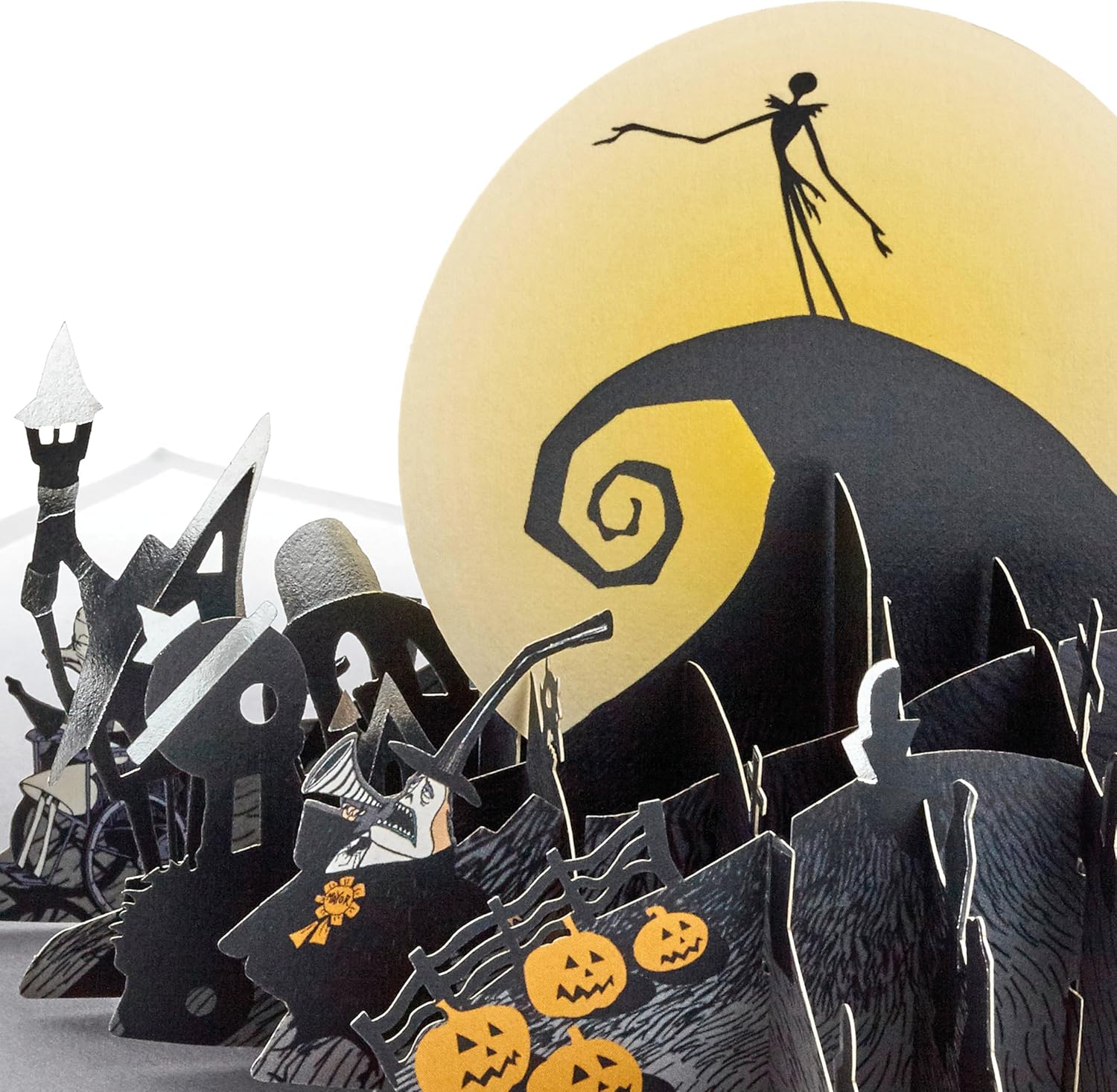 Surprise them with a scarily festive Christmas card and send them a spooky message with this 3D and pop up The Nightmare Before Christmas card. The perfect way to make them feel super special and full of love this Christmas. Open this card to reveal a pop up surprise of a 3D The Nightmare Before Christmas scene with silver foil details, with Jack Skellington on the iconic Halloween Town hill, Sally, Lock, Shock and Barrel, and Oogie Boogie. This product is fully recyclable, and made of material from well-managed, FSC-certified forests and other controlled sources. With enough space for your own Christmas wish and special festive moment, and accompany it with our Christmas message, 'Wishing you a day so good it's scary', the perfect way to make them smile. This card measures 17.3cm by 11.9cm when flat, and 9cm by 23.8cm by 17.3cm when constructed, and is accompanied with a Hallmark Signature branded, silver foil lined white envelope. Within UK 'Large Letter' Size Limits.