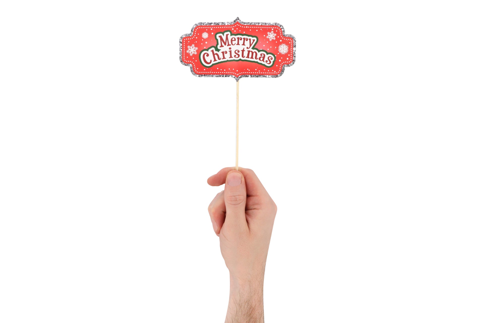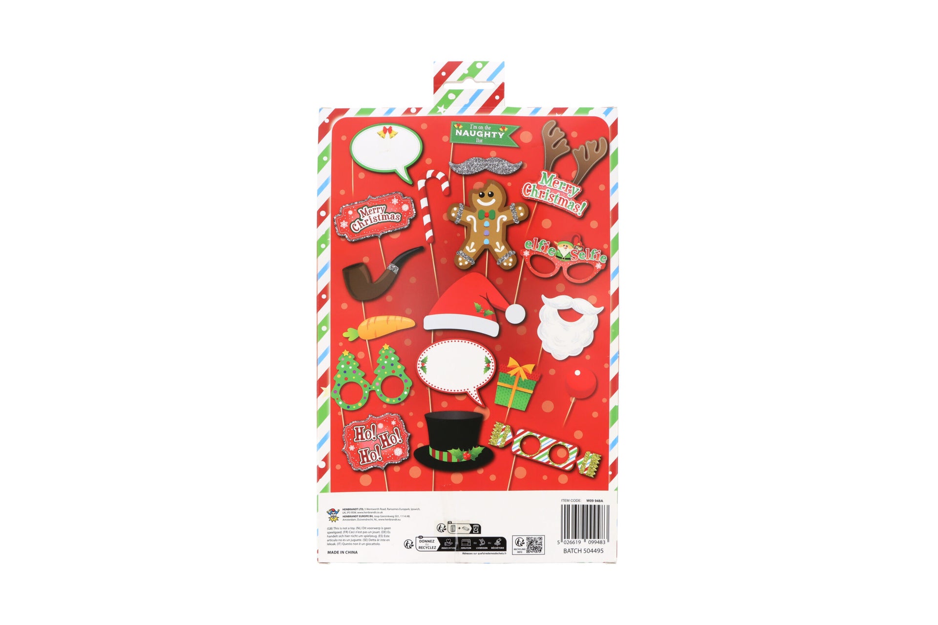 Pack of 20 Pieces Christmas Photo Props. This 20 piece pack of Christmas themed photo props is ideal for any festive party. Each prop has an attached stick. Assorted pieces including Santa hats, red Rudolph noses and slogans.