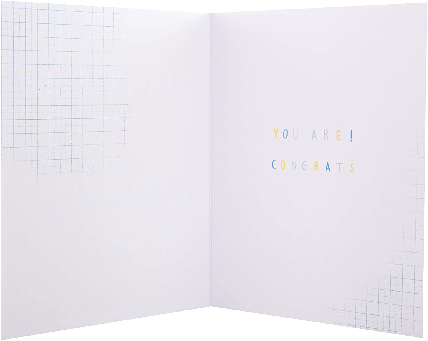Daddy-to-Be Neon Inks and Foil Details Design Greeting Card. Finish: Silver Foil, Embossed. Contemporary text based design. Co-ordinating Kraft envelope. Front cover wording: 'Who's the daddy-to-be?' Message inside card reads: 'you are! Congrats'. Size: 167 x 140mm.