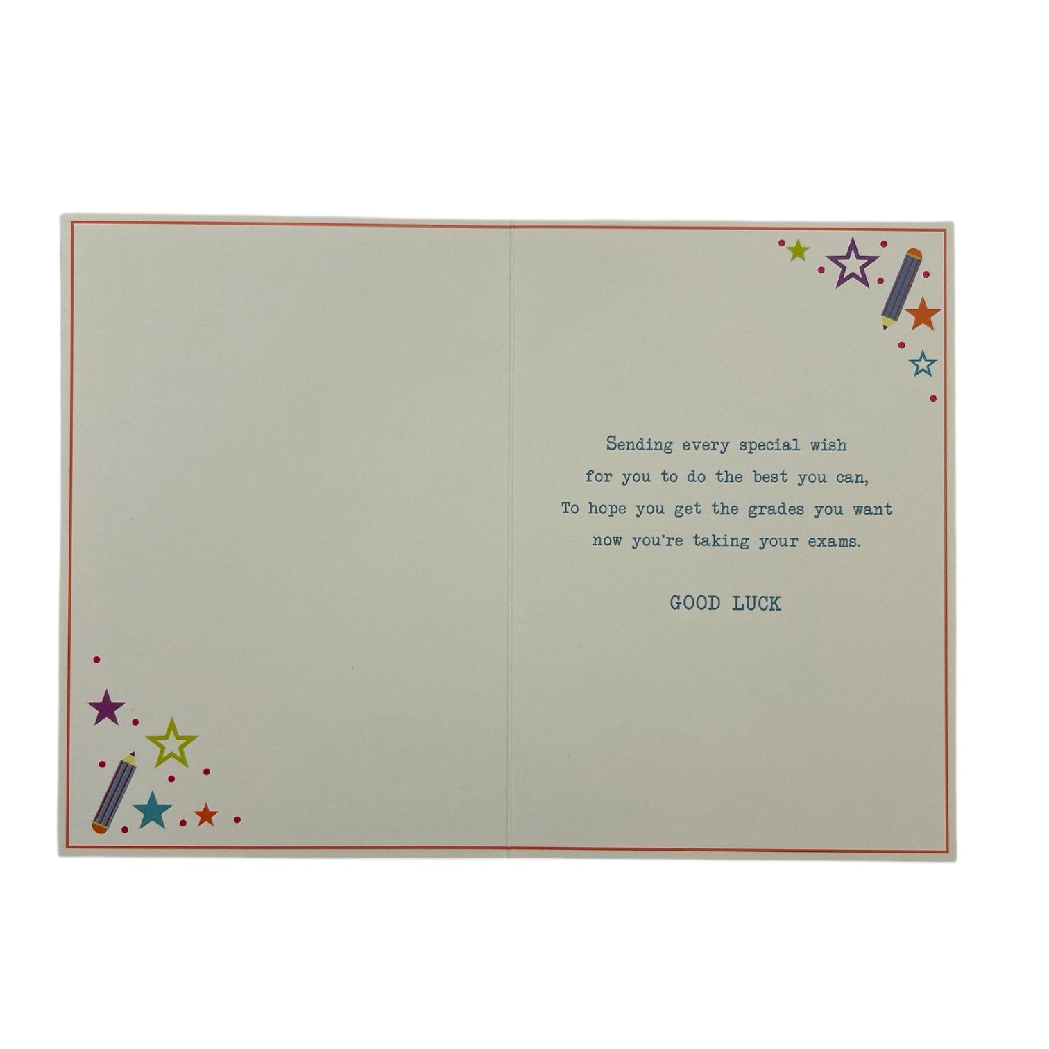 The text combines stylish script and bold, metallic gold lettering. The design includes decorative gold and multicolored stars scattered around the text, along with small illustrated pencils for a studious touch. The card has a warm and supportive feel, perfect for wishing someone success and confidence in their exams. Complete with a coordinating envelope. Card size: Approx. 19.5 x 14 cm.