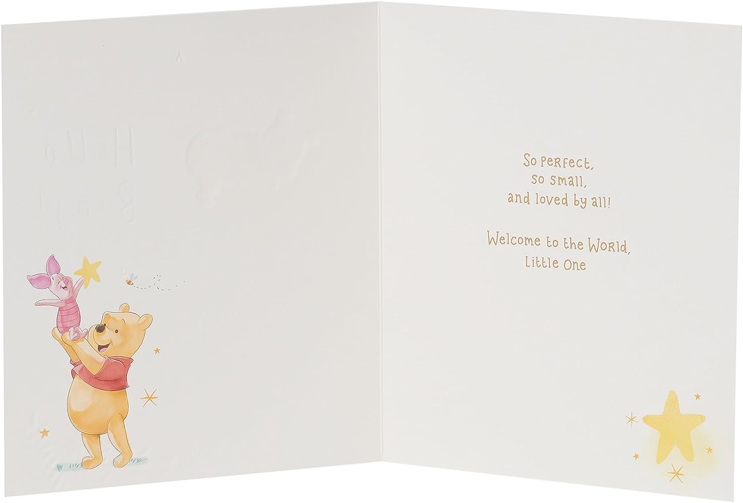 Say hello to the new baby with this cute Disney Winnie the Pooh card, embossed with gold foil. It is illustrated with Pooh bear asleep on the moon. Message Inside Reads: So perfect, so small, and loved by all! Welcome to the World, Little One. Card Size: 159 mm x 184 mm. Envelope Included.