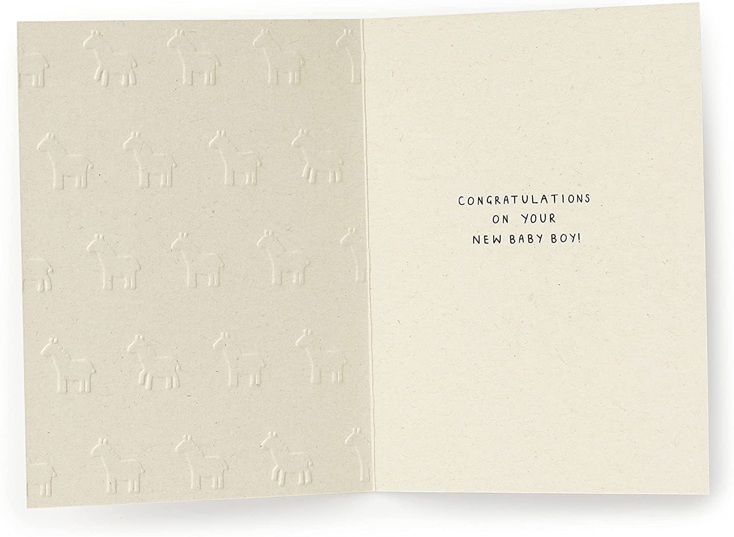 Send congratulations on the arrival of their baby boy with this zebra card, printed on premium quality board and finished with black foil. Message inside reads: Congratulations on your new baby boy! Card size: 117mm x 157mm. Envelope included.
