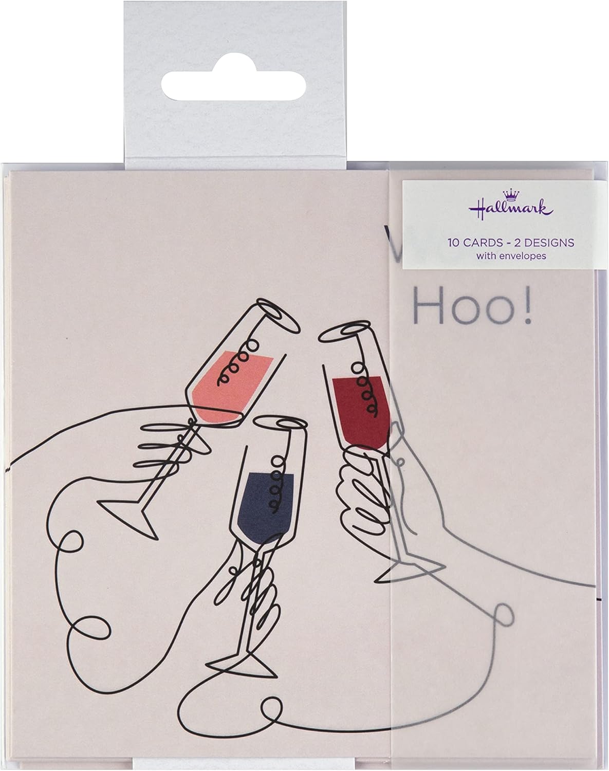 Whether it's raising a glass together; or a heartfelt congratulations message; make it sound just right,; with these beautifully designed cards; from Hallmark Fully recyclable and made using material from well-managed; FSC-certified forests and other controlled sources; this pack of 10 cards; come in 2 separate designs; with 5 in each design Cards Come Complete with Co-Ordinating White; Hallmark Branded Envelopes Blank Inside for your Own Personal Message Cards Measure: 13.1cm by 13.1cm; Within UK Standard 'Letter' Size Limits