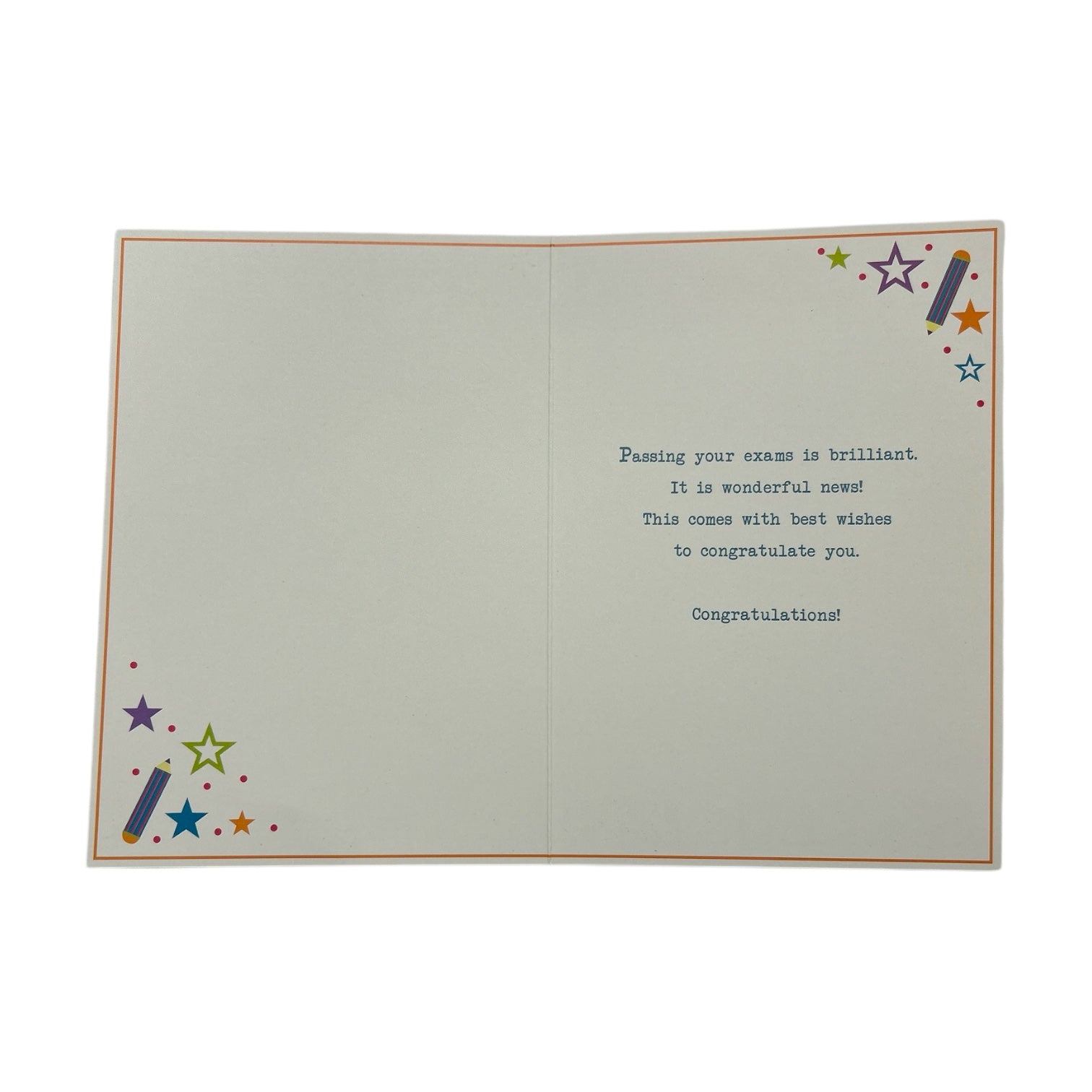 This is a congratulatory card with a celebratory design. Surrounding the text are decorative elements, including gold and multicolored stars, as well as small illustrated pencils. The card has a festive and cheerful appearance, making it perfect for celebrating an achievement. The elegant design is enhanced with embossed details foil accents. Complete with a coordinating envelope. Card size: Approx. 19.5 x 14 cm.