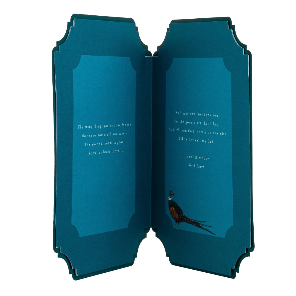 Send all your love and make your dad feel extra special on his birthday, with this lovely birthday card from our Maurice Moore collection. The perfect way to send a heartfelt note and fill his day with love. Printed on high-quality textured board, this card has a wonderful Green with traditional floral design with a sentimental quote and features die-cut corners, a paper insert, embossed elements, metallic gold foil details 3D circle paper charm attachments, a die-cut 3D attachment, and the message 'With Love, Dad, on your birthday. I just want to give you a special gift this year, to share some thoughts that you may not have had the chance to hear. So many of the good things in my life I owe to you, the way you taught what matters most and how to see things through...' on the front. This card comes complete with a Hallmark branded, cream envelope. This card is fully recyclable, and made of material from well-managed, FSC®-certified forests and other controlled sources. Message Inside Reads: The many things you've done for me that show how much you care - the unconditional support I know is always there… So I just want to thank you for the good start that I had and tell you that there's no one else I'd rather call my dad. Happy Birthday With Love Card Measures: H26cm by W18cm. Within UK 'Large Letter' Postage Size Limits.