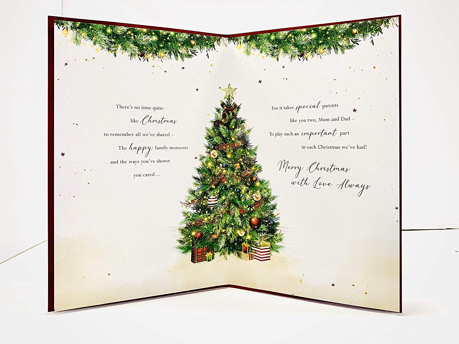 Share thanks with your wonderful Mum and Dad This Christmas with this large, luxury greetings Card. The classic design is completed with 3D gold heart and bow attachments for a touch of sparkle! Editorial inside reads: there's no time quite like Christmas to think of both of you, and thank you for the loving things you always say and do... There's no time quite like Christmas to remember all we've shared - the Happy family moments and the ways you've shown you cared... For it takes special parents like you two, Mum and Dad, to play such an important part in each Christmas we've had! Merry Christmas with love always. Envelope Included. Size: 254 x 165 mm.