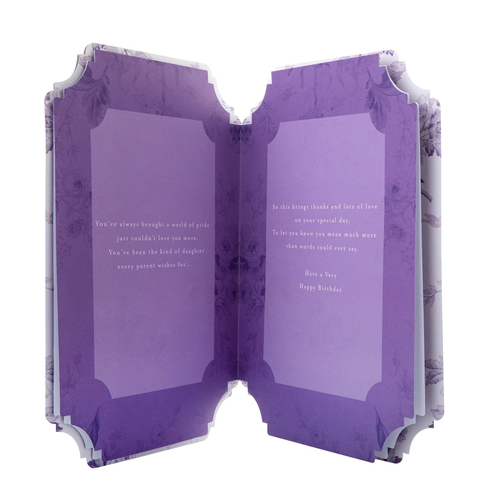 Send all your love and make your daughter feel extra special on her birthday, with this gorgeous birthday card from our Maurice Moore collection. The perfect way to send a heartfelt note and fill her day with love she deserves. Printed on high-quality textured board, this card has a wonderful Blue with traditional floral design with a sentimental quote and features die-cut corners, a paper insert, embossed elements, metallic gold foil details, 3D heart paper charm attachments, a die-cut 3D attachment, and the message 'For a Wonderful Daughter on your birthday. To have you in the family has always been so great, that's why your birthday brings a lovely chance to celebrate - you make life very happy each day the whole year through with all your thoughtful, loving ways and just by being you...' on the front. This card comes complete with a Hallmark branded, cream envelope. This card is fully recyclable, and made of material from well-managed, FSC®-certified forests and other controlled sources. Message Inside Reads: You've always brought a world of pride - just couldn't love you more, you've been the kind of daughter every parent wishes for… So this brings thanks and lots of love on your special day, to let you know you mean much more than words could ever say. Have a Very Happy Birthday Card Measures: H26cm by W18cm. Within UK 'Large Letter' Postage Size Limits.