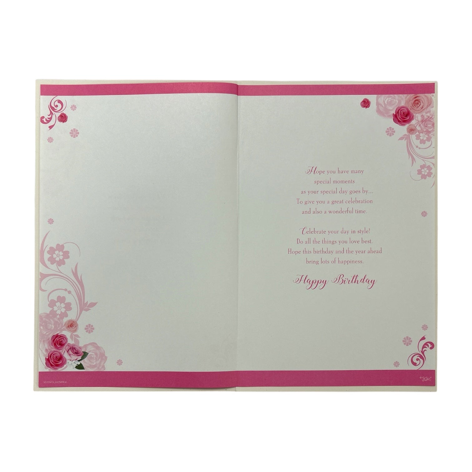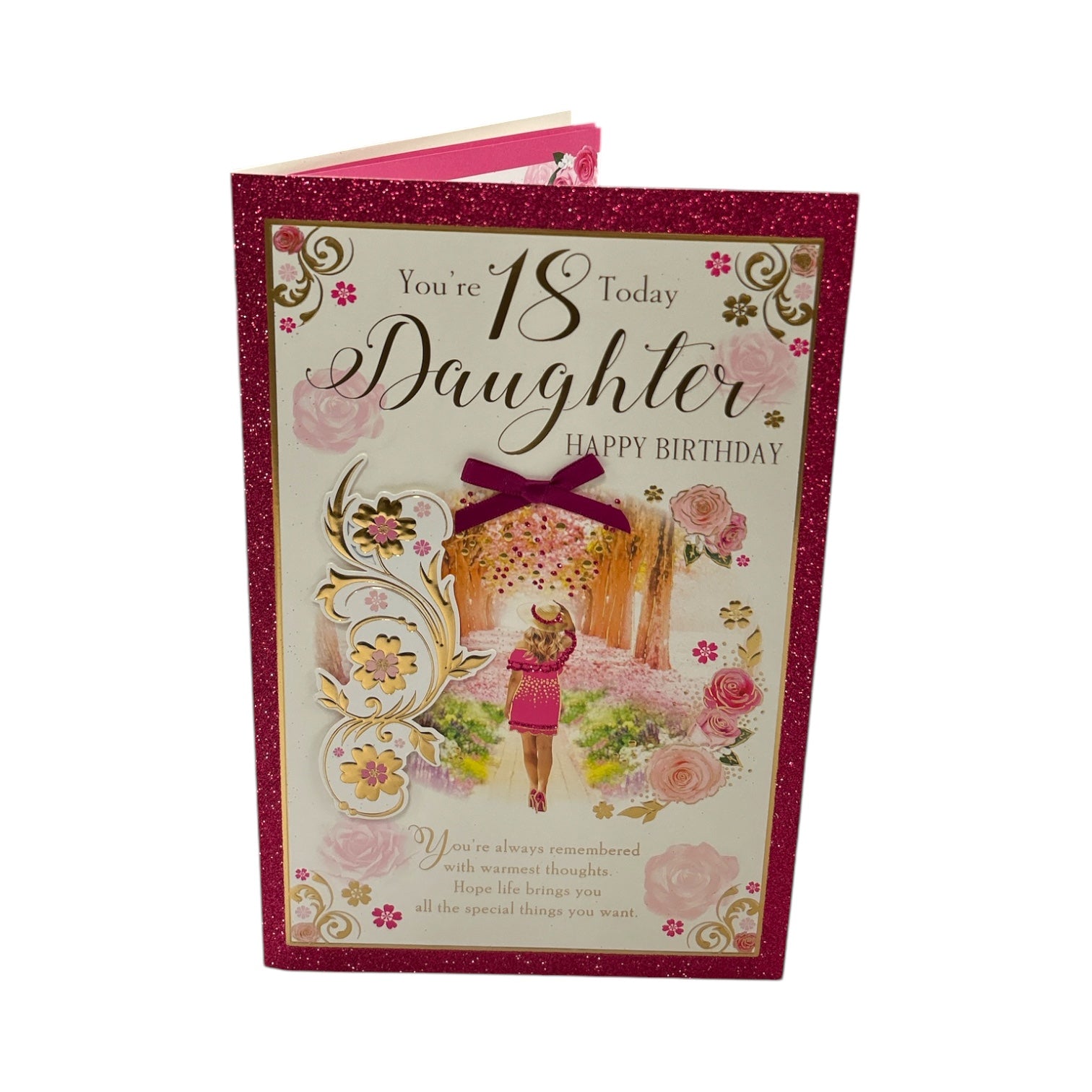 18th birthday card features gold foil lettering and pink glitter wishing your daughter a happy 18th birthday. A lady is shown walking through a park enjoying spring blossoms surrounded by trees, capturing the spirit of new beginnings. This beautiful card comes ready to give with a pink bow, making it perfect for celebrating your daughter reaching this milestone birthday. The message inside will convey your love and hopes for your daughter as she starts this new chapter at 18 years old. The card comes with a coordinating envelope. Approximate size: 27.5x18.5cm.