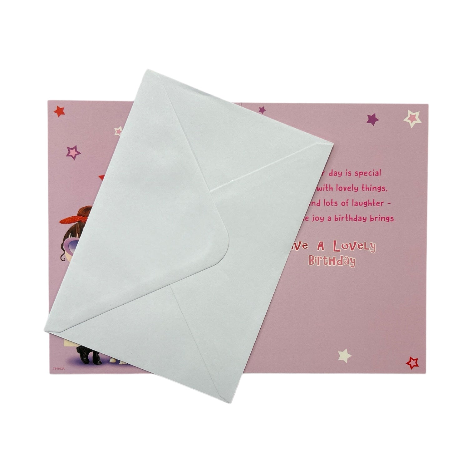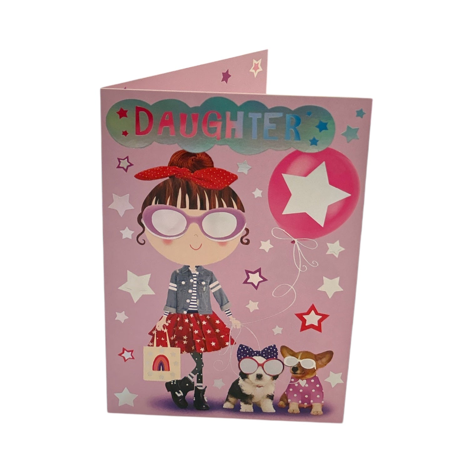 Make your daughter’s birthday shine with this stylish and fun card! The front features a fashionable girl and her two adorable dogs, all sporting trendy outfits and cool sunglasses, adding a playful and chic vibe. The background is a soft pastel purple, adorned with multicolored stars that enhance the celebratory feel. A cute pink balloon floats above the girl’s head, complemented by a shiny rainbow bag, adding extra flair. At the top, the words “DAUGHTER" are prominently displayed in a multicolored, slightly embossed font, making the design pop. The card’s overall atmosphere is cheerful, lively, and full of joy, making it the perfect choice to celebrate your daughter’s special day. Inside, the card includes warm birthday wishes. The card comes with a coordinating envelope. Card size approx. : 19 x 13cm.