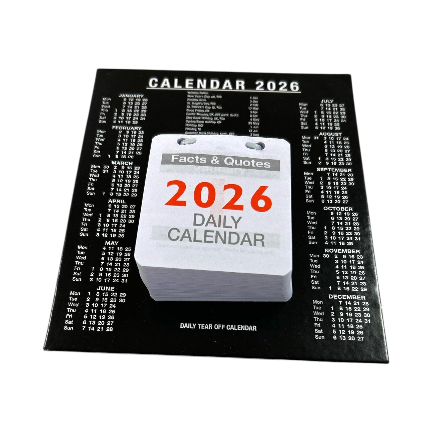 This handy daily desk calendar features a 12 month reference calendar, as well as bold tear off daily date pages for easy reference. The convenient design can be wall or desk mounted for easy access. The calendar measures 150 x 185mm.