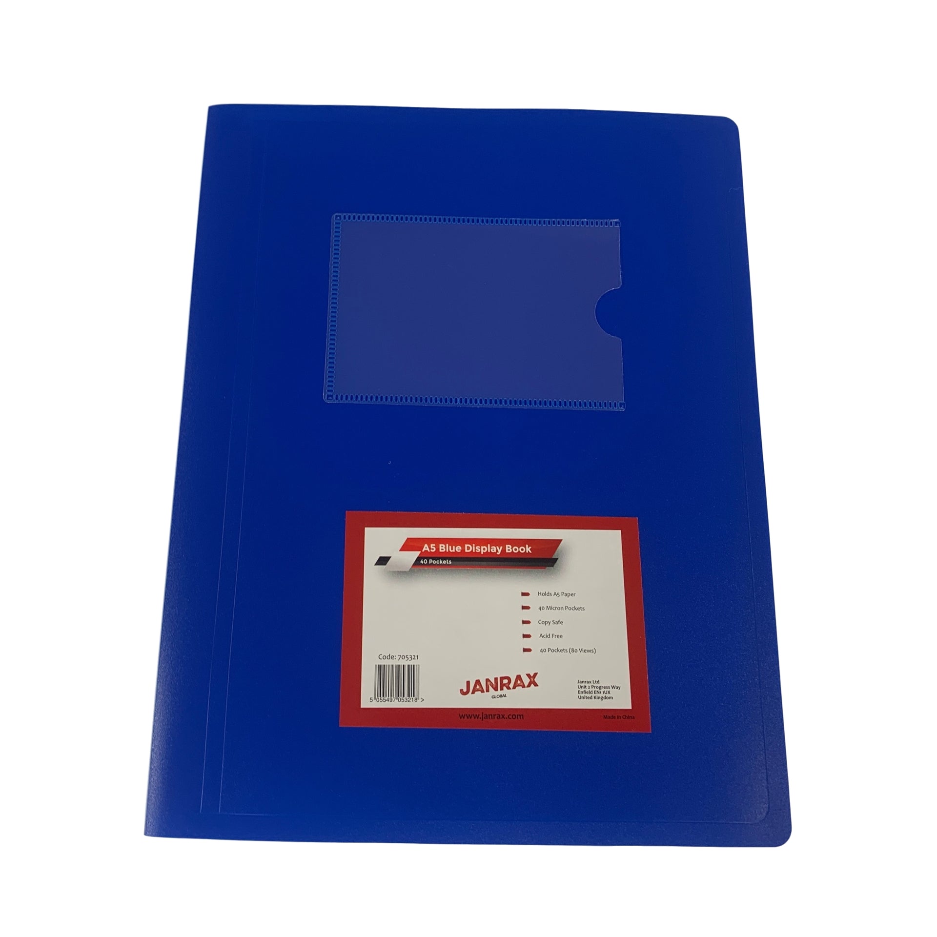A5 Blue Flexible Cover 40 Pocket Display Book by Janrax. Ideal A5 display folder for work or school use. Perfect for presentations, filing, storage, coursework etc. Can be used for landscape or portrait orientation. Business card size holder on the front cover to personalise. Copy Safe. Acid Free. 400 micron cover. 40 micron glass clear pockets. More colours and pocket quantity available in the Janrax range.