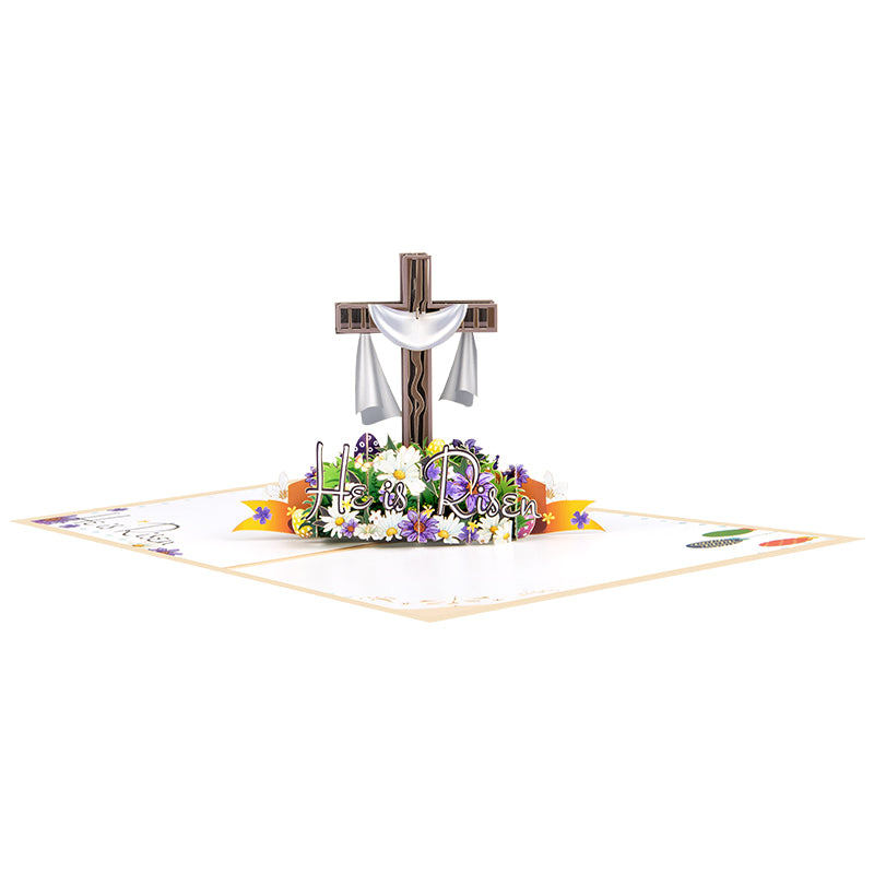 Celebrate the joy of Easter with this beautifully designed 3D pop-up greeting card. Opening the card reveals a wooden cross draped with a white cloth, surrounded by colorful flowers, symbolizing the resurrection of Christ. The bold words “He Is Risen” appear in elegant script, reminding recipients of the hope and renewal of Easter. Measuring 15 x 20 cm, the card includes a blank insert (8.5 x 13 cm) for your personal message, making it perfect for Easter celebrations, church gatherings, or sending blessings to loved ones. The cover mirrors the design with the same uplifting message and floral accents, ensuring the card is meaningful inside and out. With its intricate craftsmanship and faith-inspired theme, this card is more than a greeting — it’s a keepsake that honors the true spirit of Easter.