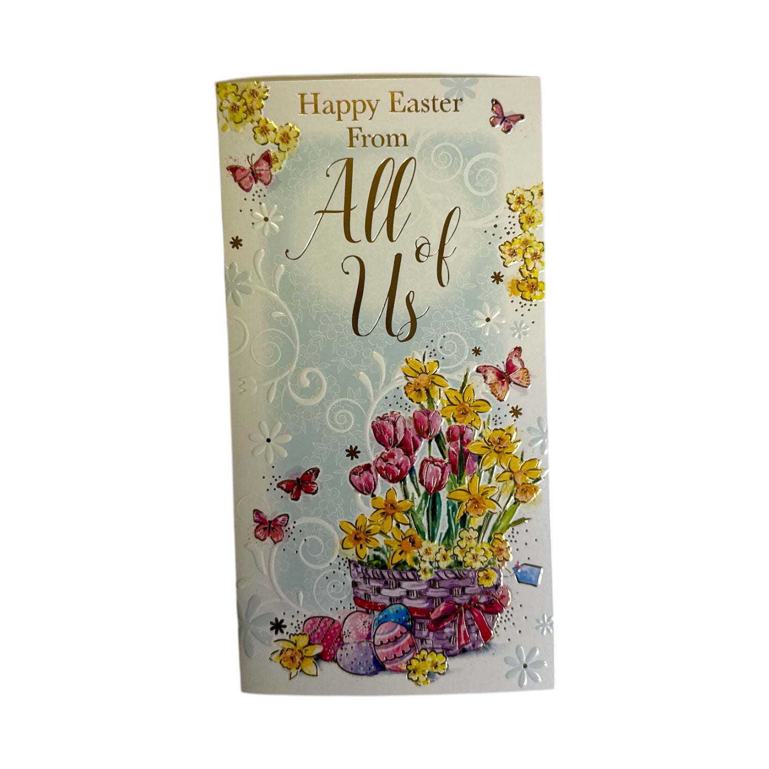 A pretty card, perfect for sending kind, heartfelt messages to special friends or family members this Easter. Featuring a pretty design of pink and yellow spring flowers and butterflies, embossed floral add a whimsical touch to the festive design, with an "Happy Easter From All Of Us" message on the front and easter wishes message inside. The card comes with a coordinating envelope. Card size approx. : 23 x 12cm.