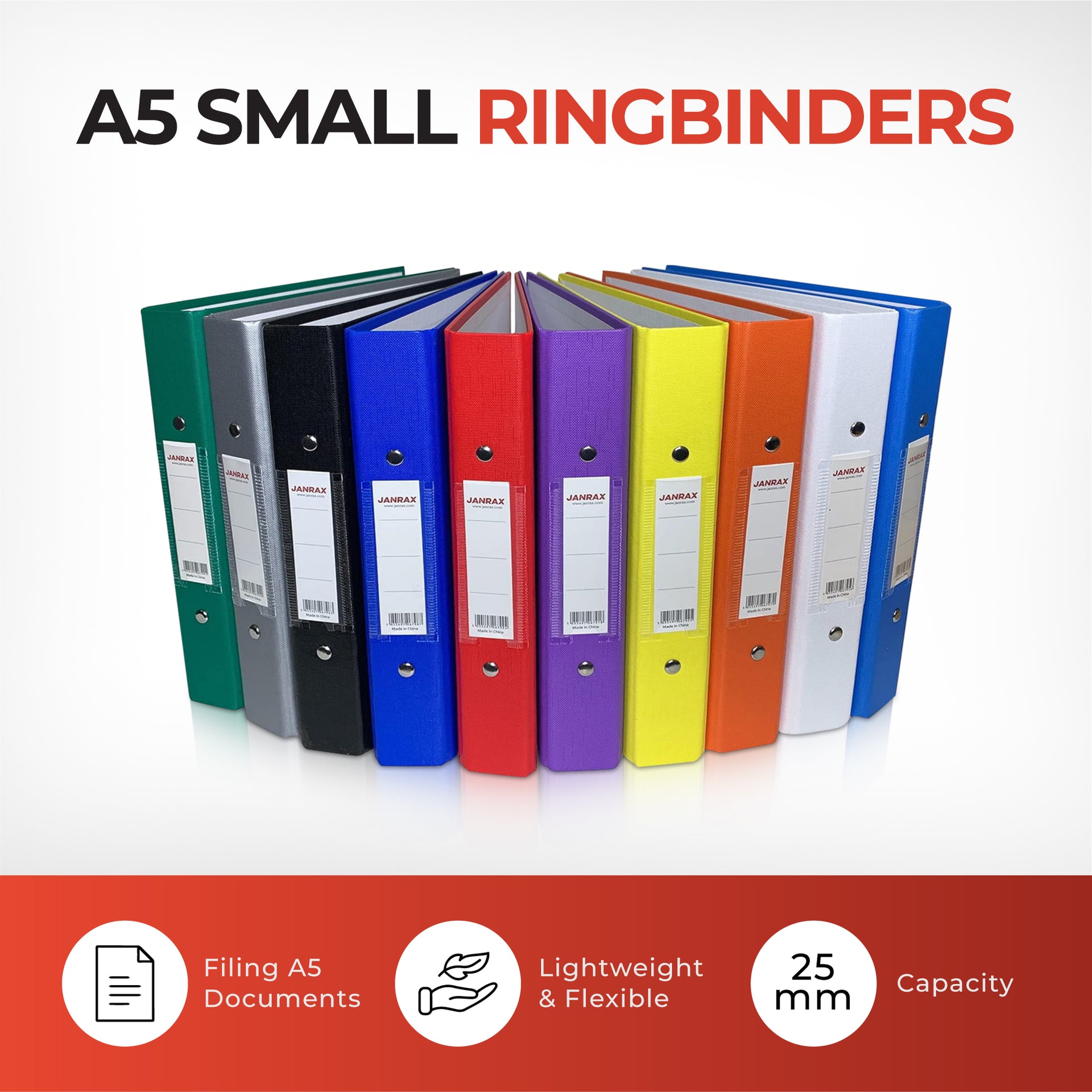 Pack of 5 A5 White Paper Over Board Ring Binders by Janrax. These durable ring binders feature a standard 2 O-ring mechanism with a 25mm capacity for filing A5 documents. 35mm Spine. The ring binders also feature durable paper over board covers and spine label for quick identification of contents. Available in a range of colours from the Janrax range, ideal for colour coordinated filing.