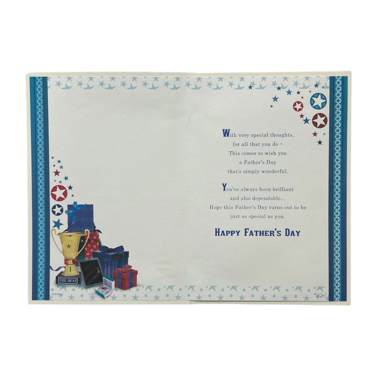 Celebrate Father's Day with this thoughtful Card. The front features a striking design of a trophy, gifts, and rewards, symbolizing the honor and appreciation you have for the special father in your life. Enhanced with foil details and embossed elements, along with a glitter finish, this card sparkles with elegance and charm. Inside, you'll find sentimental wishes that convey your heartfelt gratitude and love. This card comes with a coordinating envelope. Card Size: Approx. 27 x 18 cm.