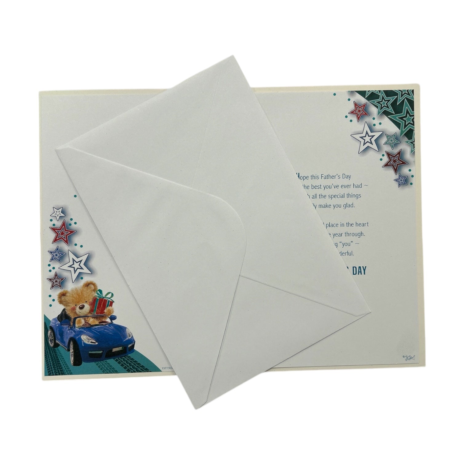 Celebrate your husband's special day with this charming Father's Day Card. The front features a cute teddy driving a blue car, with a trail of bursts of stars in the background, evoking a sense of joy and excitement. The design is enhanced with foil details, embossed elements, and a glitter finish, adding a touch of sparkle and sophistication. Inside, a heartfelt Father's Day message expresses your love and appreciation for him. Making it the perfect way to show your husband how much he means to you. This card comes with a coordinating envelope. Card Size: Approx. 27 x 18 cm.